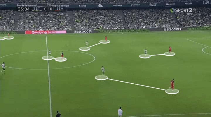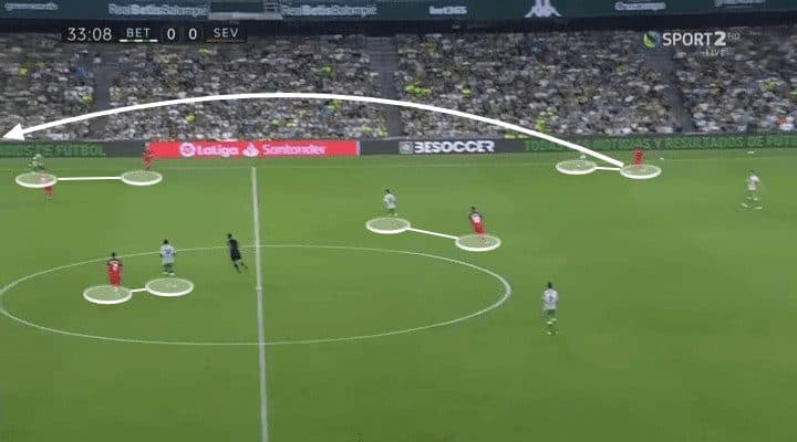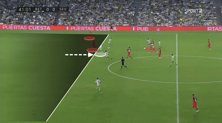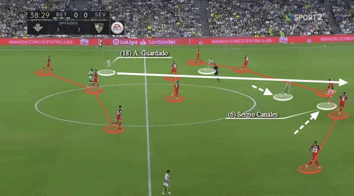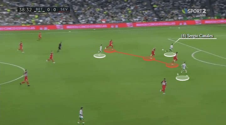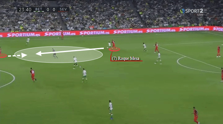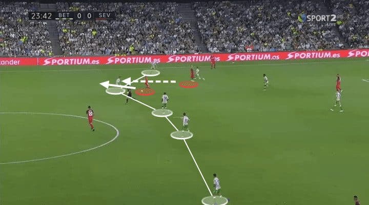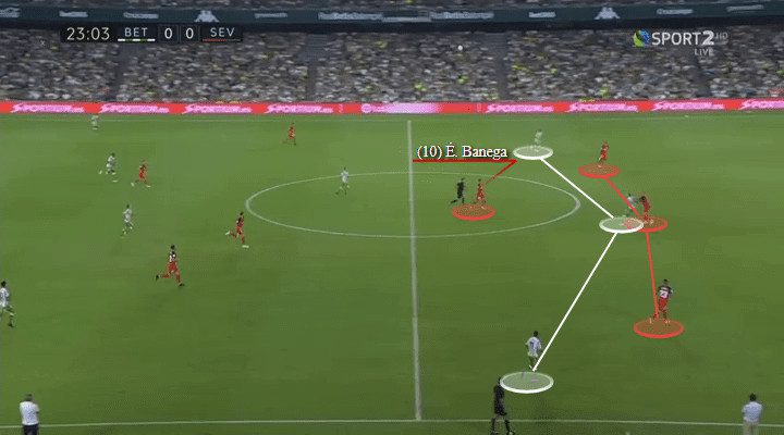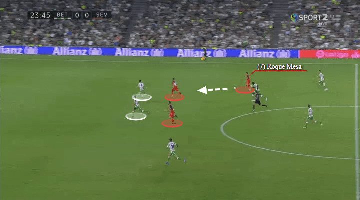 So, having less luck than their opponents in playing long over the press, Sevilla had to find another way. With a midfield boasting Roque Mesa and Éver Banega, Sevilla looked to get their two midfield players on the ball in transitions from defence to attack. Quick combinations were made to play around the Betis press.