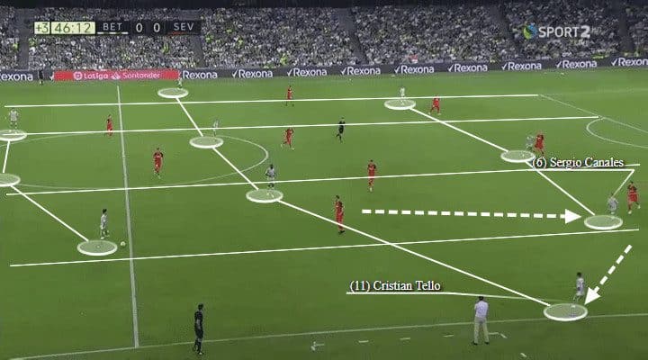 Given Betis’s patience against this kind of defensive block, Setien’s men were able to push Sevilla back into their own half a little more frequently and allow their forwards and midfielders to move more freely, creating havoc for the Sevilla defence. The Betis system relied heavily on their right flank. Cristian Tello played as the right-wing-back and stayed in space on the right wing during the build-up while Sergio Canales had most licence of the front 3 to move freely between the lines. Canales is a clever off-ball mover and almost put his side ahead in the first half after a brilliantly timed run and finish, only to be contentiously ruled offside.