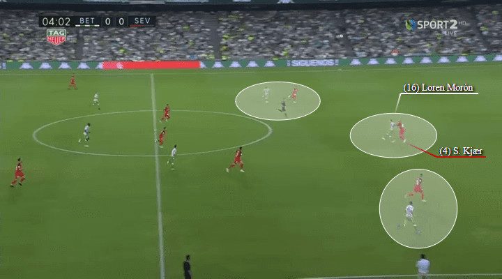 But this left a large unoccupied area of space between the Sevillistas’ midfield and back 3 and it didn’t take Los Verdiblancos long to take advantage of it. Béticos looked to exploit the gap in the Sevilla structure and played the ball long to their front 3, particularly targeting the tallest of them, Loren Morón. Morón was marked tightly by Sevilla’s Danish centre-back Simon Kjær and the two had an intense physical battle throughout the night.