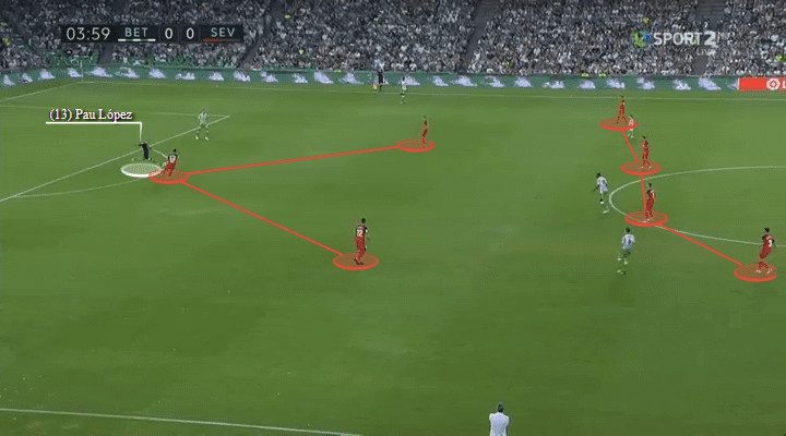 Although the Betis defence and midfield is positioned to play out patiently from the back, keeper Pau López sees the gap beyond the press and goes direct.