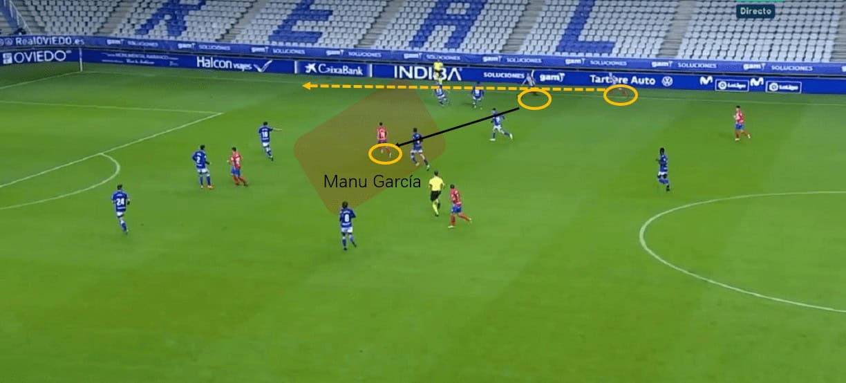Apart from underlapping to exploit the space, they could also deploy a third-man to utilise the space. That would usually be the former Manchester City player Manu García. He was the striker on the paper but he was a playmaker in the game, moving to the ball side, asking for the ball to feet and dictating the play. He could release some creative final passes or direct finishing on his own.