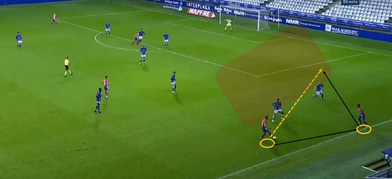 After conceding the goal in the 38th minutes, Gijón was searching for solutions to pose threats on Oviedo’s goal and they succeeded, though not scoring the actual goal. They deployed the winger and the full-back on the same side to occupy the width together in the front. The flank defensive-unit-duo of Oviedo would step out to press and mark them while the rest of the players in 1-4-4-2 block of Oviedo sat more centrally. An opening corridor on the half-space was therefore created by the doubling width. Later, the flank attacking unit could use underlap to exploit the vacated corridor, creating a high-quality chance for delivering crosses.