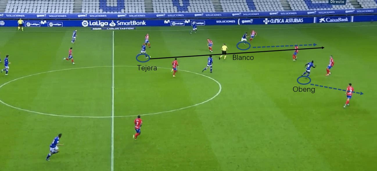 As Tejera latched onto the ball, Blanco cued his run to attack the space behind the defensive line. Obeng ran diagonally outwards to stretch the line horizontally. Then Tejera seized the timing and released the pass into the space behind the defensive line, finding Blanco. Blanco received the ball on the half flank and hit a high-quality cross, creating a huge threat for Sporting Gijón.