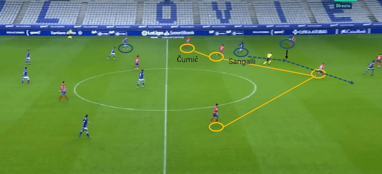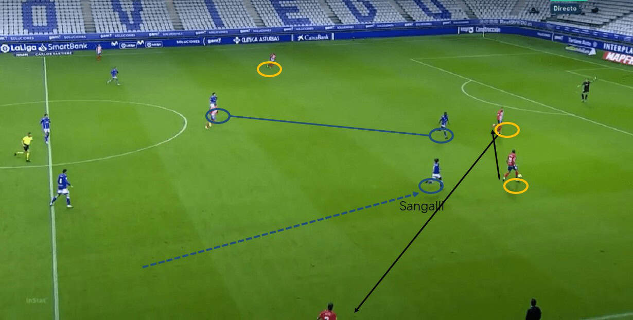 To make this direct approach more effective, the shape of Oviedo wouldn’t be a classic 1-4-4-2. Instead, the right-winger/midfielder Sangalli would come inside, staying behind two strikers and behind the opposition midfield line compactly, in order to control the second ball. Sangalli is good at dribbling and manipulating the opponent’s defensive line with his penetrative passes. Also, the central midfielders would stay compact to two strikers and Sangalli, ready for any second balls to come.