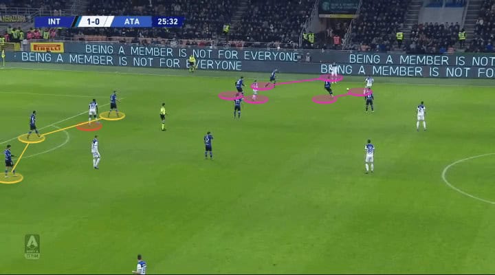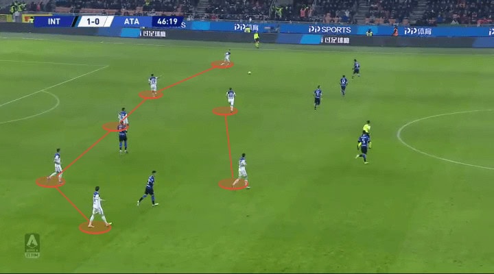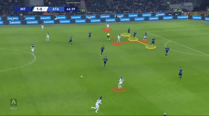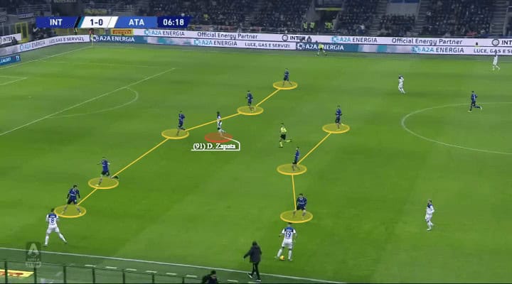 Having Zapata as their dominant striker in the first half didn’t work out exactly due to Inter’s well-executed split of responsibilities and marking strategy. He would often be isolated and unable to combine with his teammates. What the team needed was more players able to switch positions, pick up the ball and position in the box. Which is exactly what Gasperini did and I’ll explain it later in the analysis.