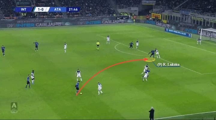 The easier way for Inter to penetrate was counter-attacking. Martínez would drop back helping with defensive actions and counter immediately after winning the ball back. Lukaku was extremely quick switching to attacking actions, especially after defending set-pieces. Atalanta’s defence conceded five counter as they weren’t able to structure properly and outplay Inter’s front duo.