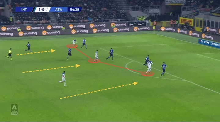Later on, Gasperini made one more change, getting Pašalić off and playing Muriel. This transformed the team’s structure for the better and allowed them to execute the abovementioned idea even better. The front three started moving in a similar manner and their teammates would offer support on the edge of the box, sneaking between Inter’s players. They pinned the Nerazzurri back and switched play frequently, combined with moving off the ball in order to score.