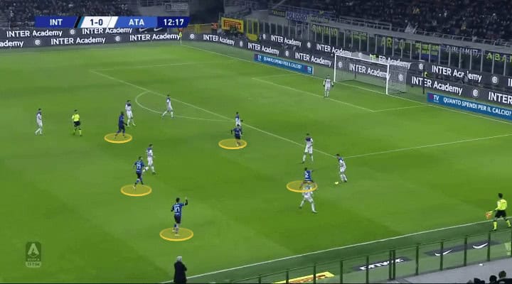 Having the midfield support allowed them to go out wide and cover the flanks where, as per usual, Atalanta committed more players in attack. Instead of many players covering the likes of the lone striker Zapata centrally, the Nerazzuri constantly moved smartly around the dangerous area. When Atalanta tried to exploit either of the wings, the central-backs would partner with the wing-backs and cover the players out wide getting the support of one of the central midfielders.
