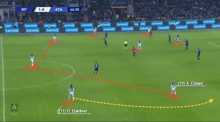 Due to the above mentioned covering strategy by Inter, Atalanta would often try to switch play using Gómez, who would try to drift into the free spaces. He would try to combine with the wing-back, whilst Atalanta would commit more players on the other side ready to receive a cross or a pass and use quick runs to the box to escape their makers and create chances.