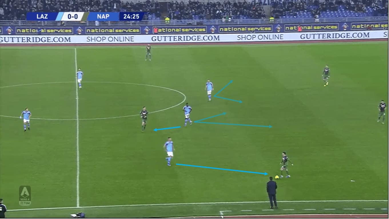 Firstly, Lazio’s defensive block wasn’t designed to press Napoli high up the pitch and instead adopted a medium block approach, with the whole team compact in a shape which engaged the opponent once they reached the middle third of the pitch. This gave Lazio all the benefits of sitting deep enough so as to protect their side against any long balls over the top as well as the ability to disrupt Napoli’s build-up play further away from their own half.