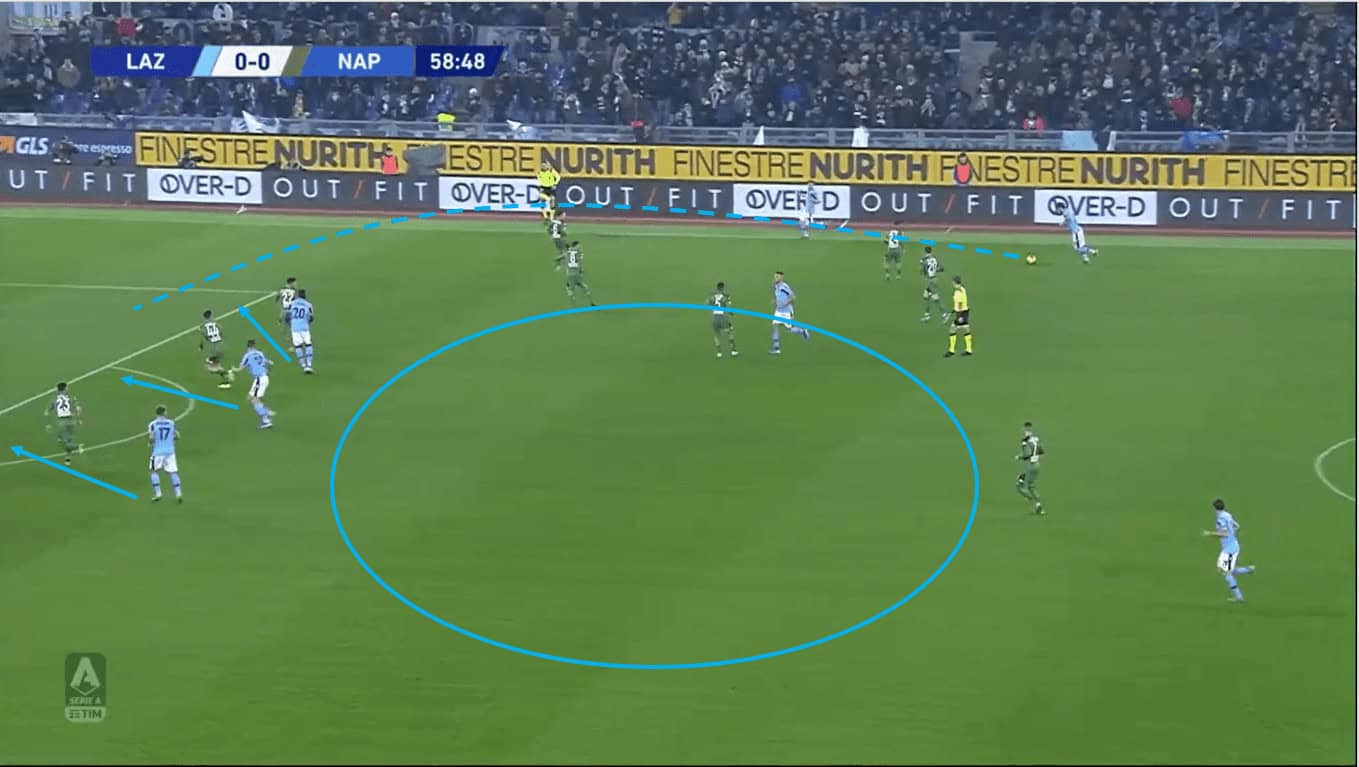 As the ball moves out to the full-back, Lazio’s defence has shifted over quicker than the other Napoli attackers, meaning the full-back has no one to combine with to move the ball forward, thus forcing the ball back where it came from.