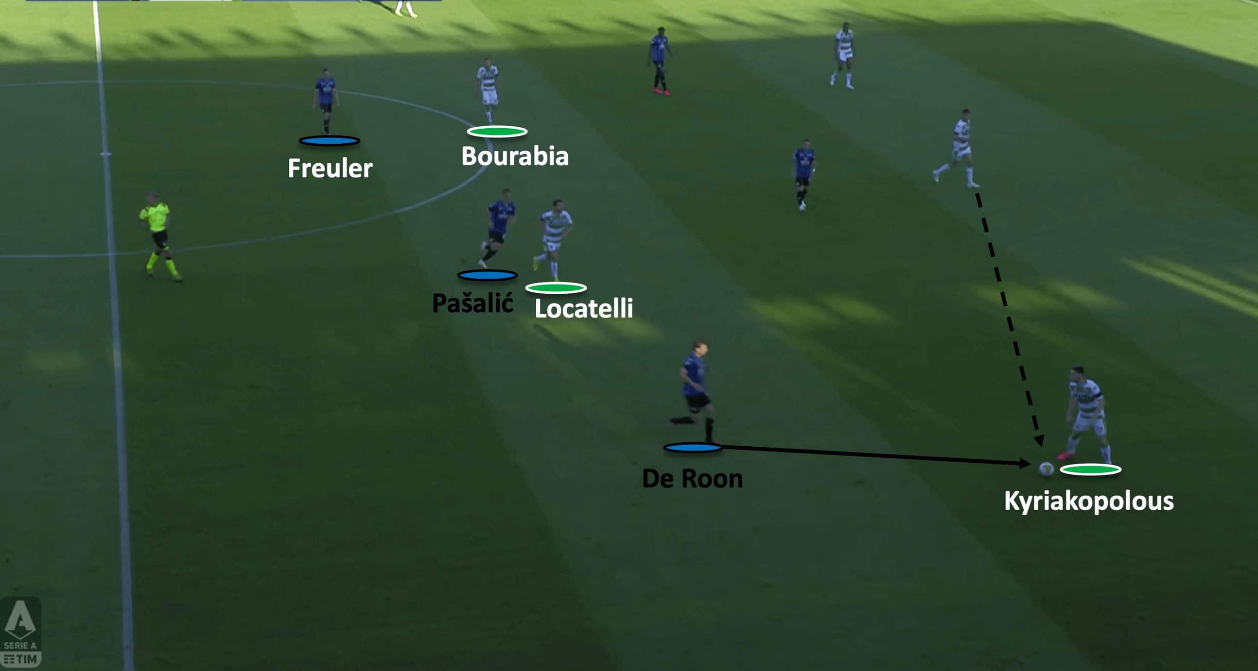 Below, we can see Atalanta’s pressing structure with the specific roles shown. Pašalić is marking Sassuolo’s near side pivot (Locatelli). Atalanta’s near side central midfielder (De Roon) presses the near side fullback (Kyriakopolous) when the ball is played to him. Serie A 2019/20: Atalanta vs Sassuolo - tactical analysis