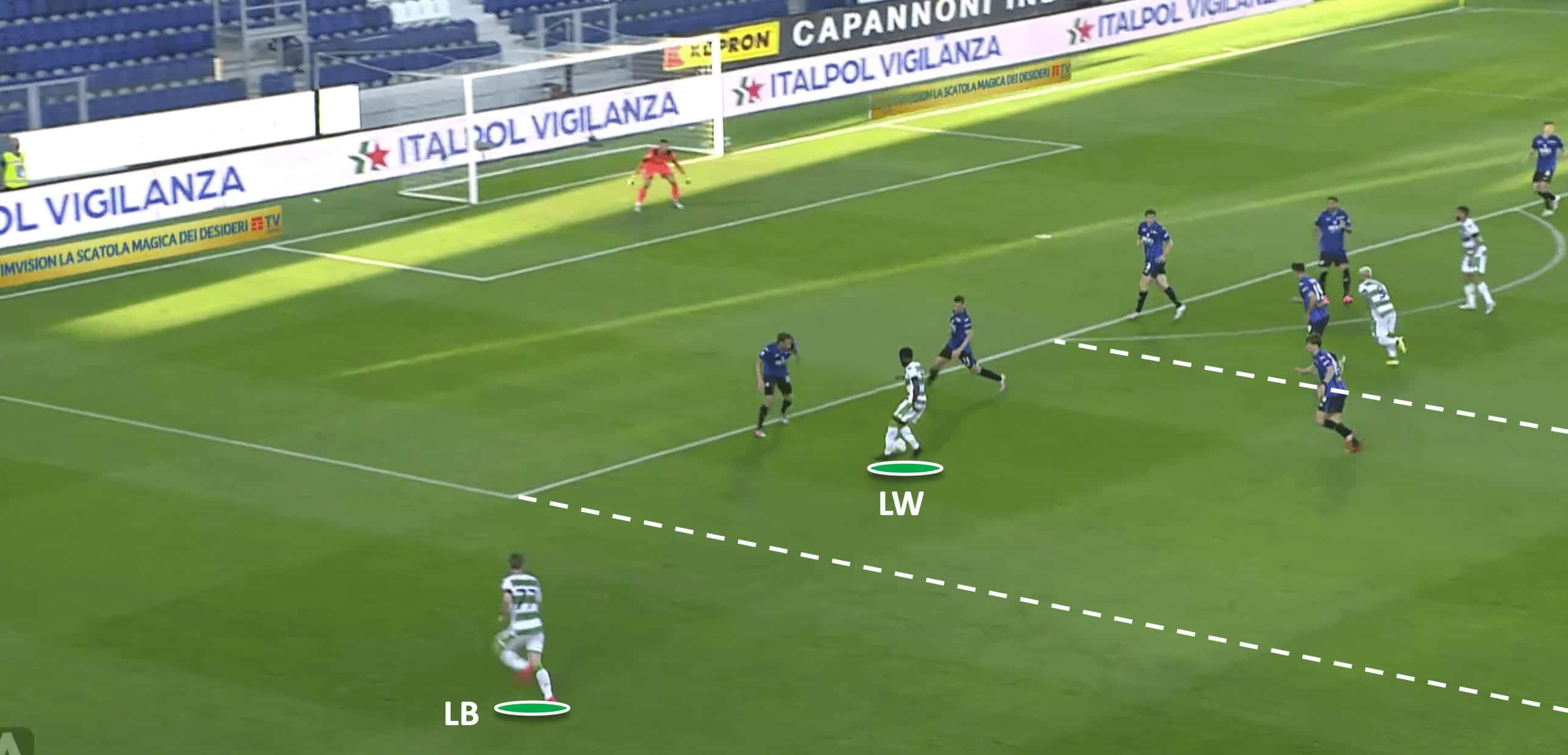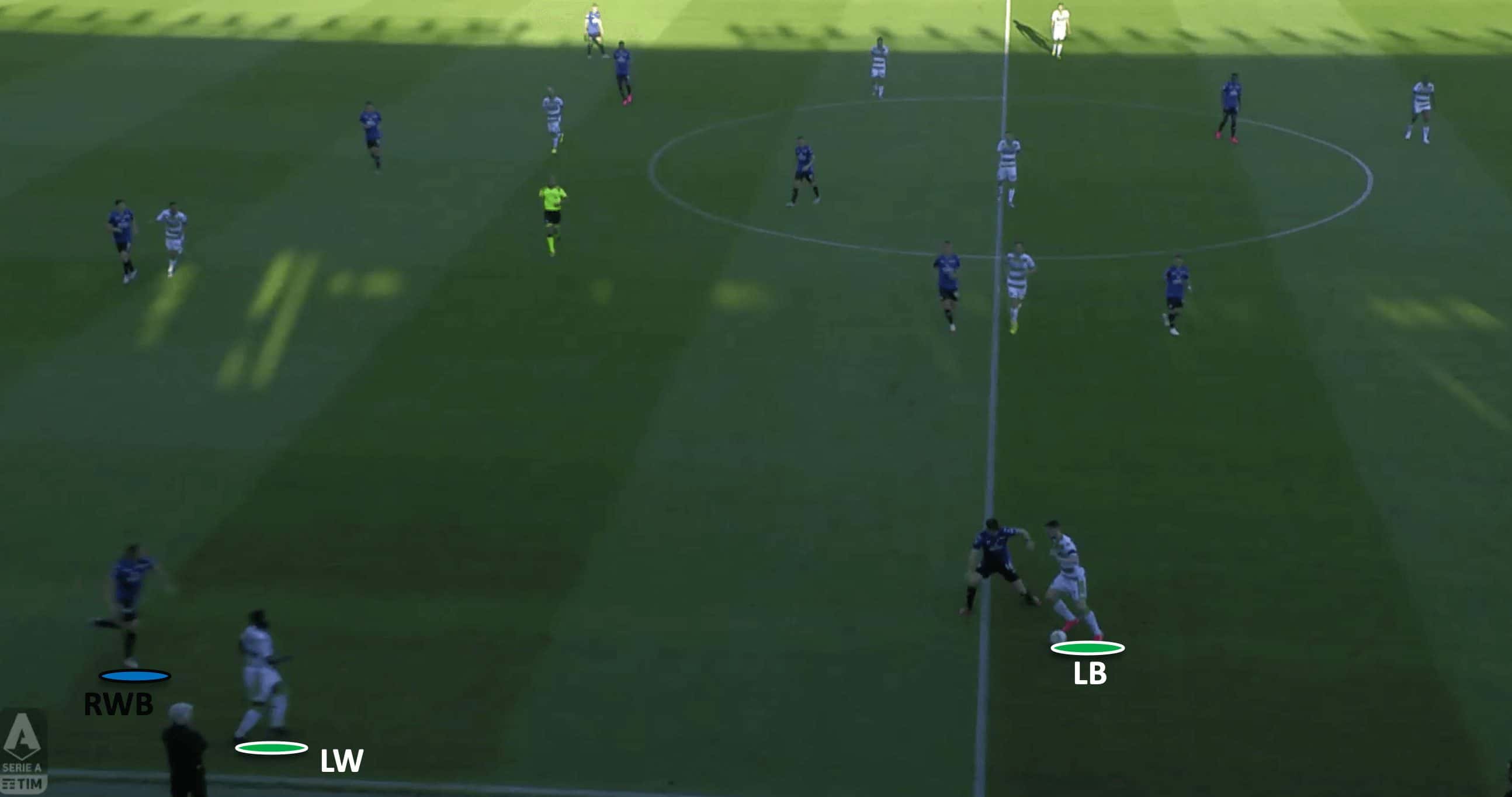 Sassuolo’s structure in the build-up with the wingers and fullback both wide changed to a typical wide rotation with the winger inverting into the halfspace while the fullback overlaps. We can see the left-back overlapping the left-winger in the halfspace in the example shown below.