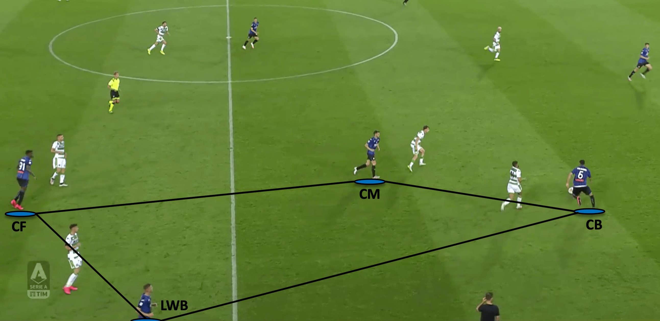 Atalanta’s attacking shape naturally creates diamonds in the wide areas, which they make great use of to create numerical advantages. The diamond usually consists of the wide centre back at the base, the wing-back and central midfielder at the sides, and the centre forward at the tip, though this is not absolute. We can see examples of these diamonds vs Sassuolo below. In the first example, we can see the left wide centre back, left wing-back, left central midfielder, and left centre forward creating the diamond.