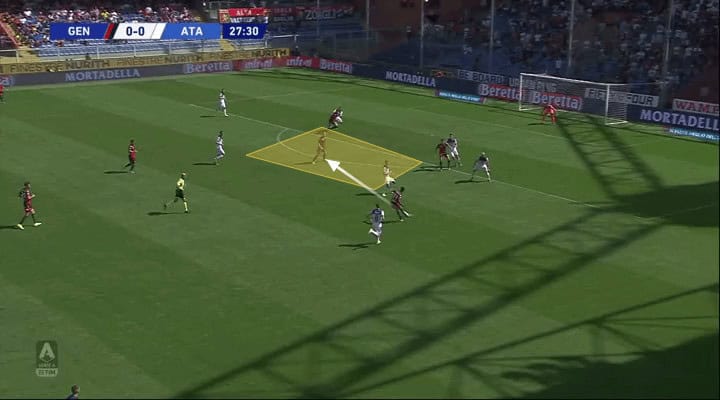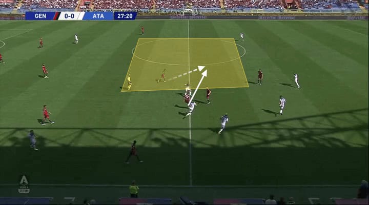 As mentioned, Genoa also looked to bypass Atalanta’s midfield with passes into the feet or bodies of their strikers. In the image below, Criscito plays such a pass into the feet of Kouamé which allows Genoa to progress the ball beyond Atalanta’s midfield.
