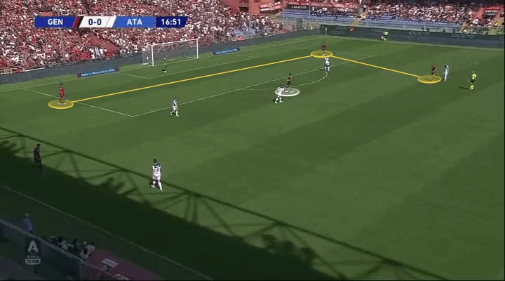 The Genoa players often played this type of pass by nature, seemingly off the cuff, with the hope of trying to catch Atalanta out. The image below highlights such a situation as the right wing-back Paolo Ghiglione plays the ball the first time and looks to find Pinamonti or Kouamé in behind Atalanta’s defence. This suggests that first time passes into depth were definitely something Genoa had talked about beforehand.