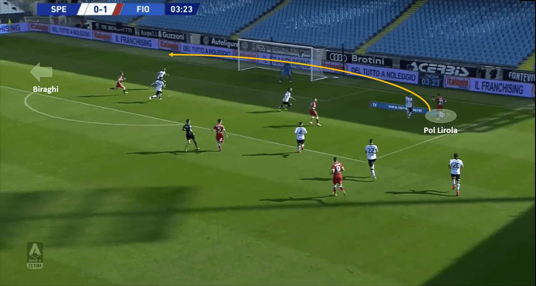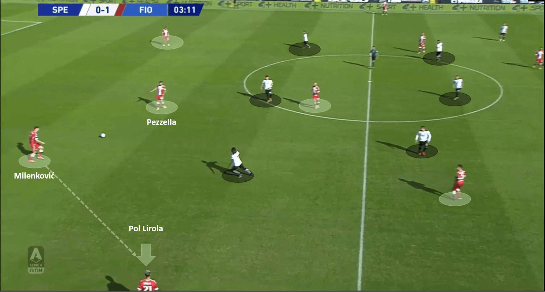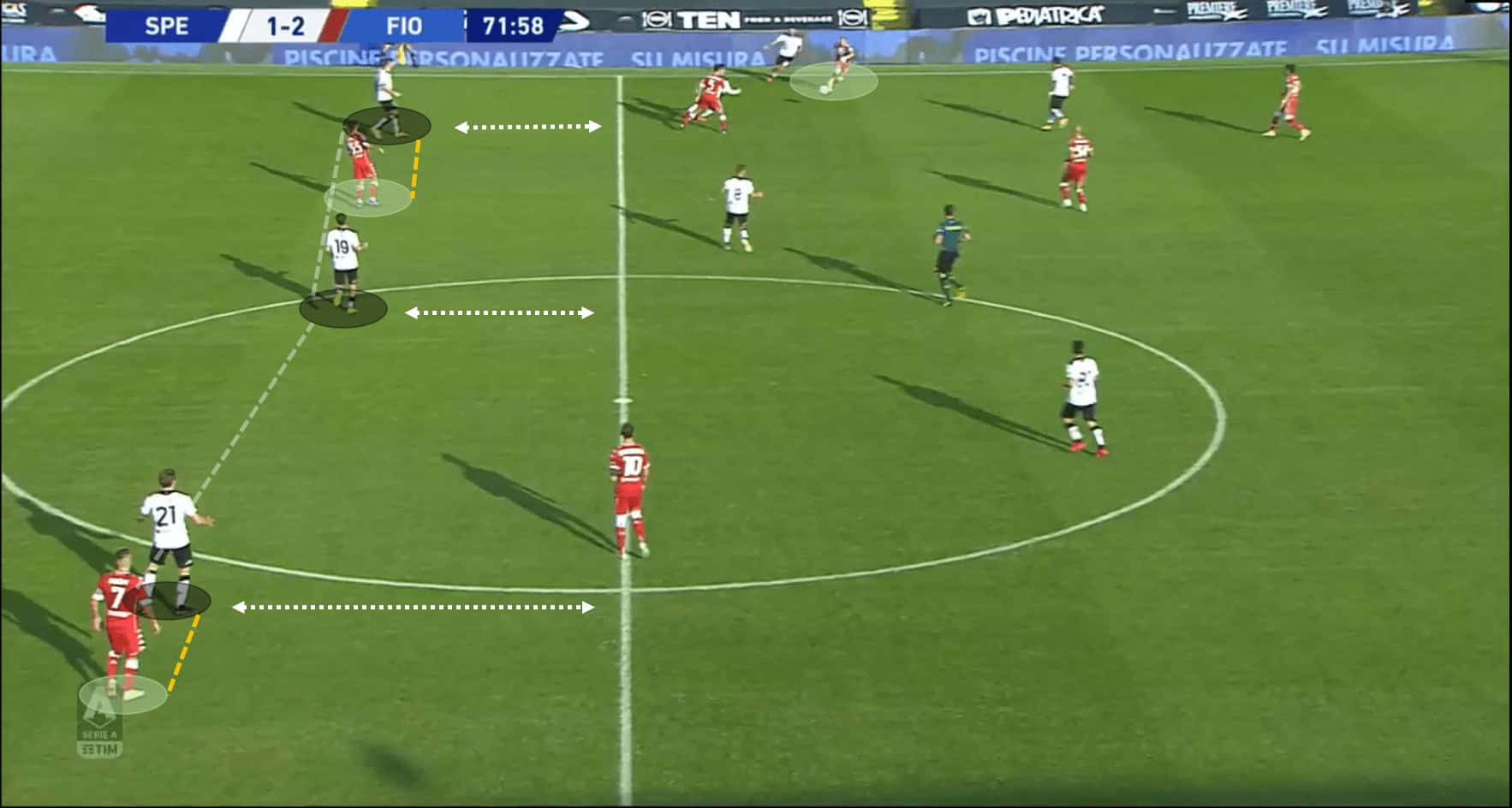 The next image is of how Fiorentina’s tactics and quick positional sense allowed them to box in the Spezia players and choke them for space.