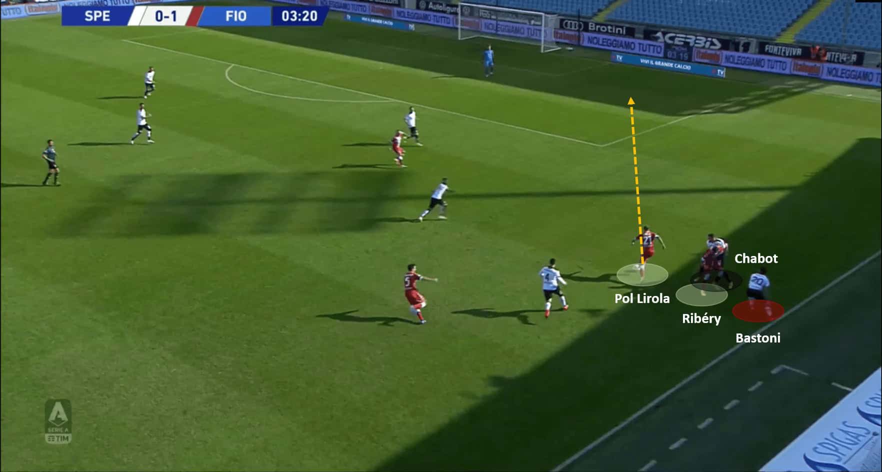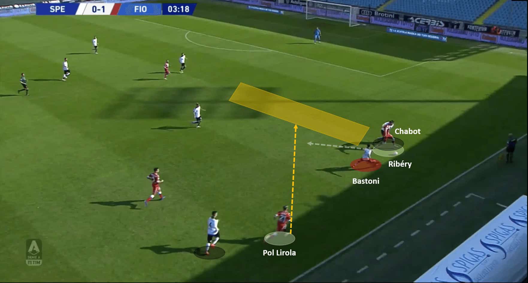 Pol Lirola picked up the ball on the right flank, and passed it towards Ribéry, who played it back into the path of the underlapping Pol Lirola. He sped into the opposition box without breaking a sweat and put in a neat cross for Biraghi – who put it into the net. The below images support the analysis by depicting how Fiorentina’s tactics came to life.