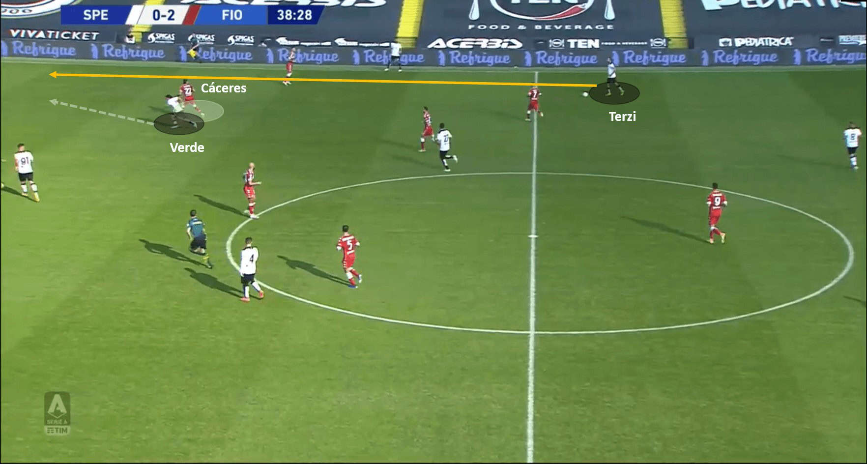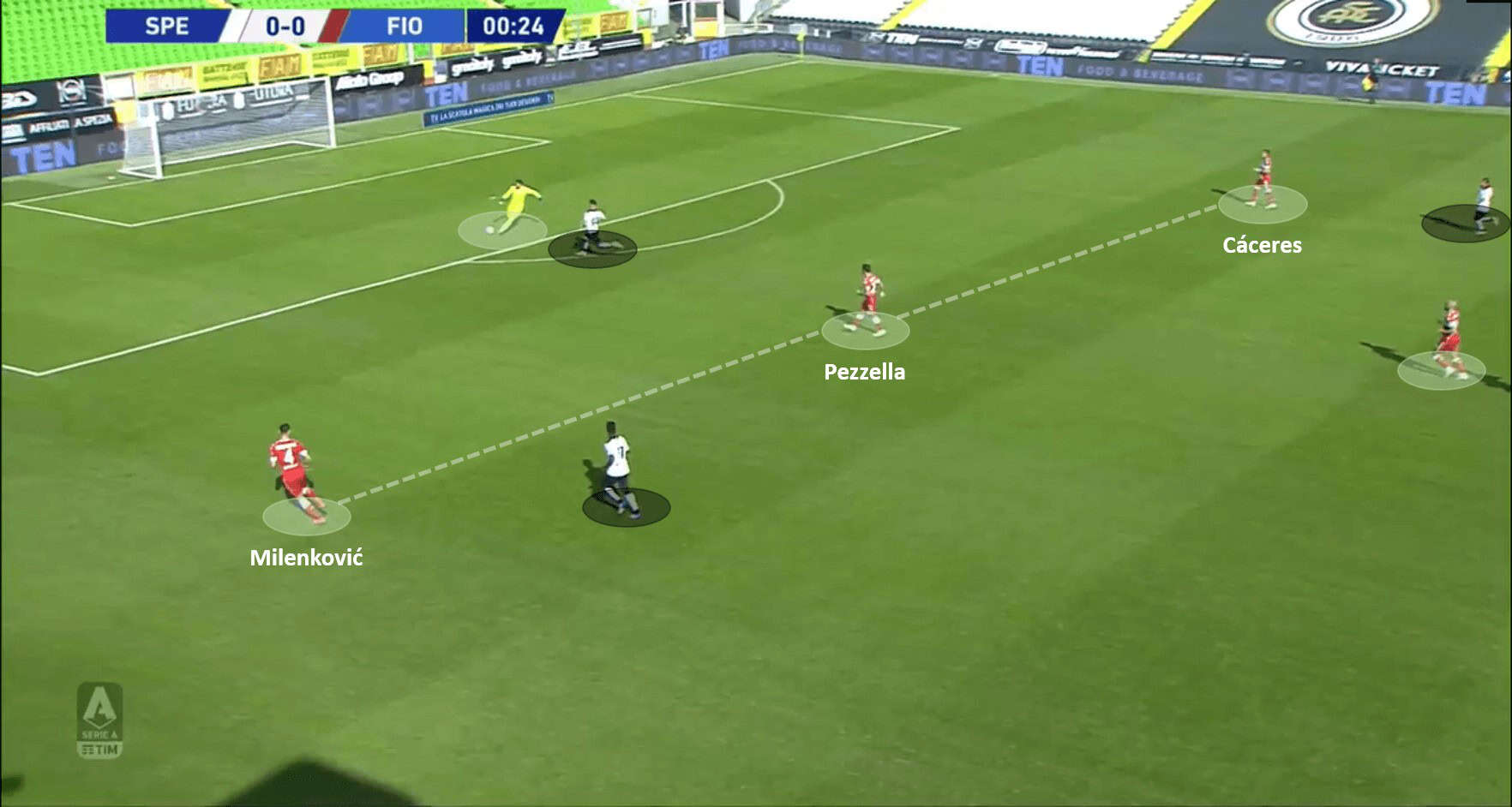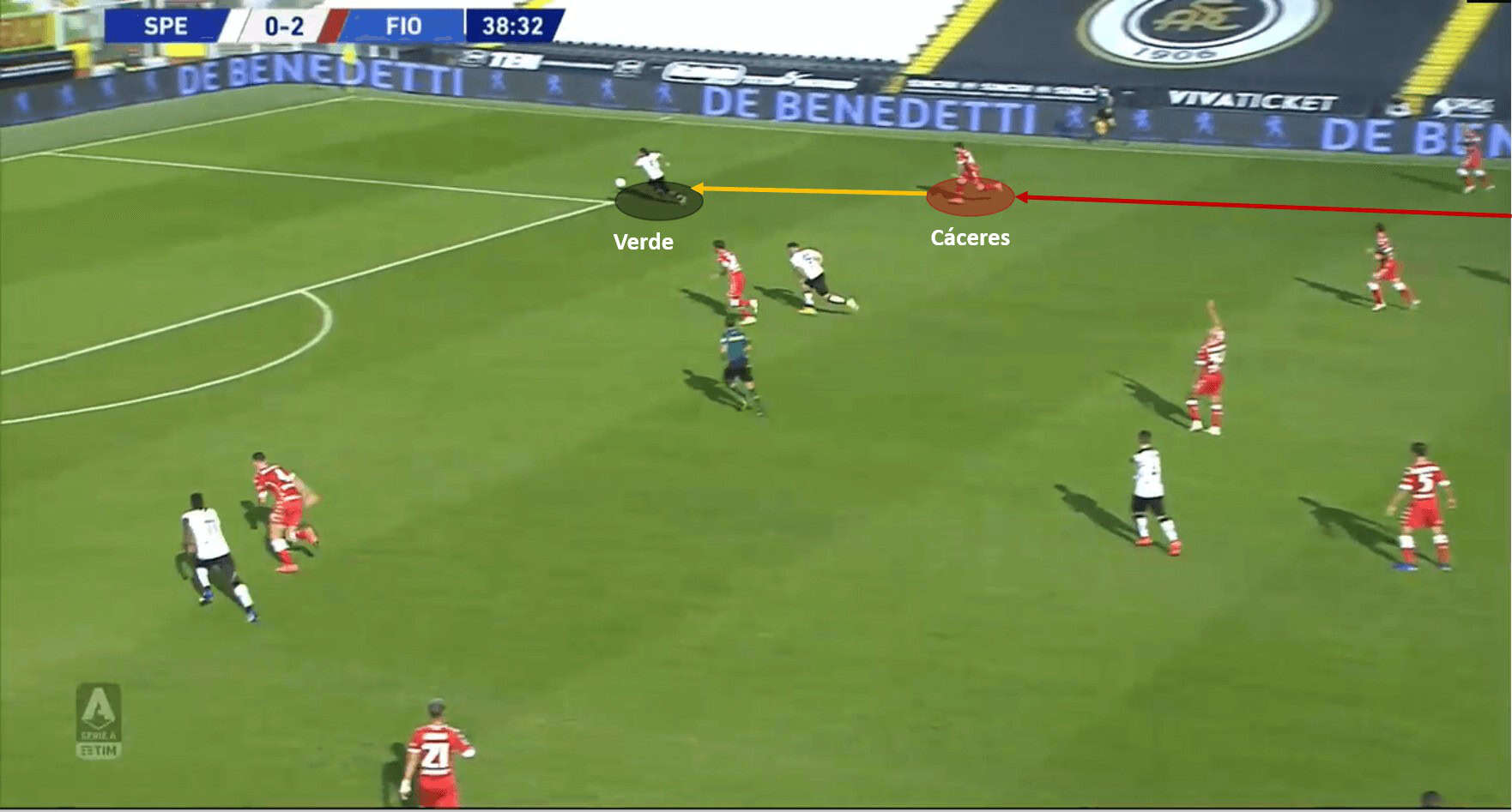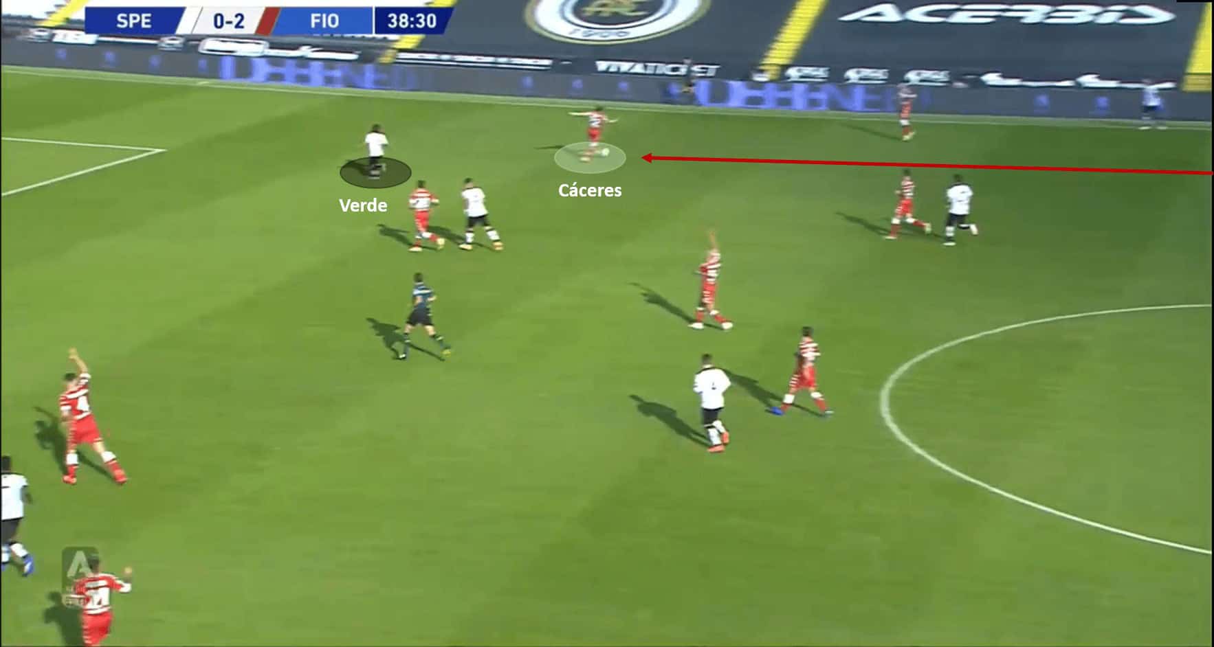 The next incident in this analysis is from Spezia’s first goal of the game. This goal saw good vision and movement from the Spezia duo of Terzi and Verde. However, what was more on display was the lapse in concentration by Cáceres. Terzi spotted Verde’s run behind Cáceres, and thought of playing a through ball around Cáceres and into the path of Verde. He did make the pass which seemed to be on its way to Verde, but Cáceres made good ground to get in the line to the ball. Cáceres had seemingly cut the move out and killed it; however, his lapse in concentration meant that he didn’t stop the ball cleanly and it slipped under the feet straight into Verde’s path. Verde then converted this into a goal after moving into Fiorentina’s box unmarked. The below images support the analysis.