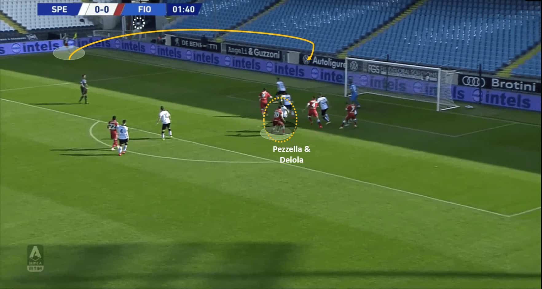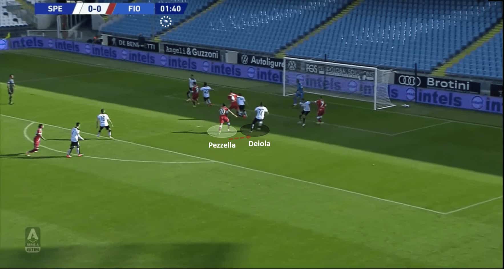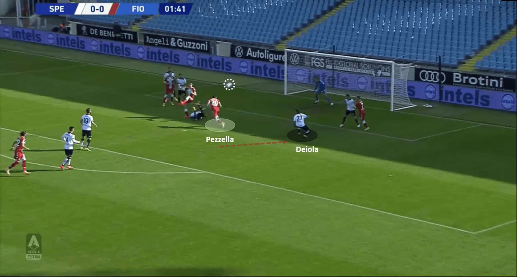 The first goal for this analysis is Fiorentina’s first in the game that came in the early minutes of the game. Biraghi took a good corner and put the ball near the penalty spot. The Spezia players seemed to have marked all of the Fiorentina shirts in the box, including Pezzella who was marked by Deiola. However, what followed was poor movement and decision making which left Pezzella unmarked in front of goal. Pezzella put an open header into the net. The below images support the analysis.
