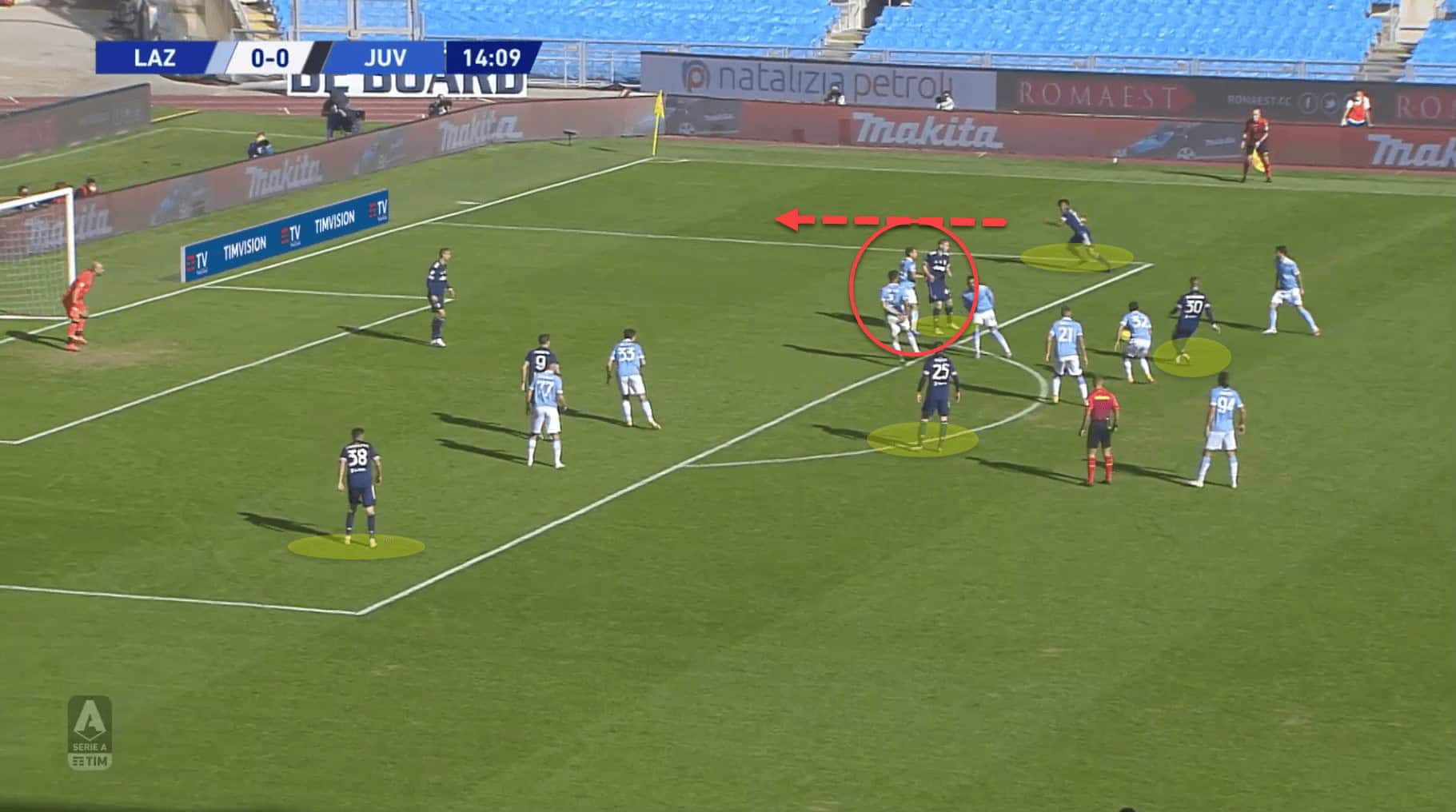 Pirlo must take massive blame for this failure to deal with the overloads as he did not tweak the formation when Lazio were in the final third. Perhaps dropping Frambotta into a back five whilst his side were defending at the edge of the box would have allowed Juventus to have a man over to stop the overload.