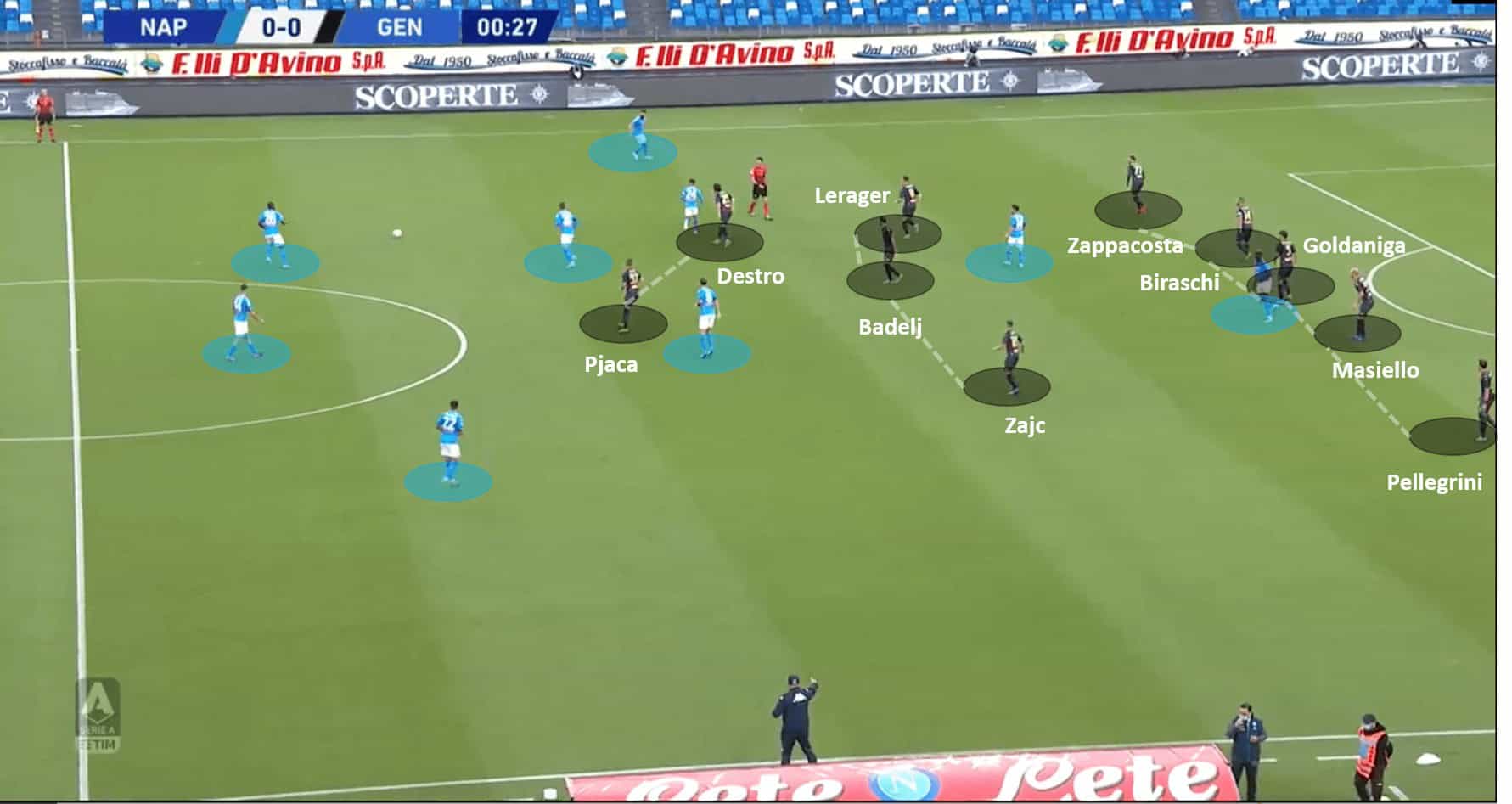 Rolando Maran set his team up in 3-5-2 game tactics, in an attempt to nullify Napoli’s width in the middle of the park and have three centre-halves to shield the goal. Federico Marchetti started in goal, with a back three of Davide Biraschi, Edoardo Goldaniga and Andrea Masiello. Davide Zappacosta and Luca Pellegrini played as the wingbacks to double up with attacking and defensive duties. The midfield three consisted of Lukas Lerager, Milan Badelj and Miha Zajc. Mattia Destro and Marko Pjaca played in a front two for Genoa.