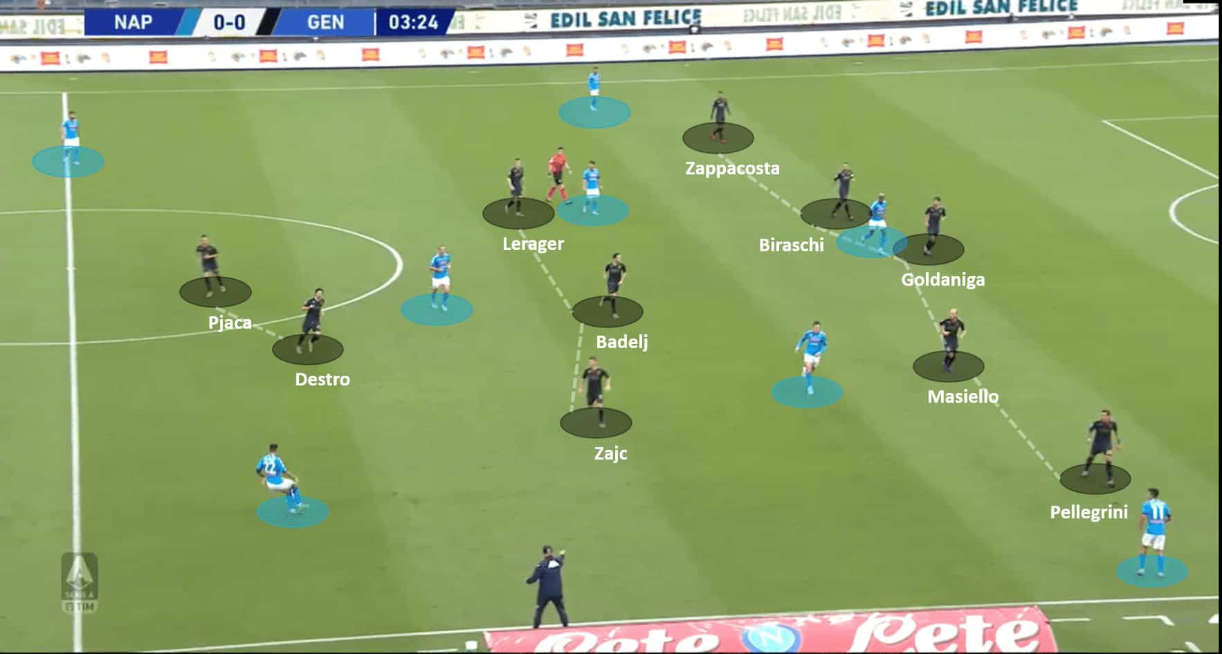 The first section of the tactical analysis takes a look at both teams’ off-the-ball shape, and the press tactics used. It is an analysis of how either teams setup in terms of tactics and in terms of their pressing intensity to win the ball back when they were out of possession. It is hard to argue that the result doesn’t reflect the true outcome of the game. Genoa held decent possession of the ball and did play some good ball too. But one of the key factors for their thrashing result, was their lack of fluidity in defensive shape and the lack of intensity they showed to win the ball back. This section of the tactical analysis shows how Genoa’s aforementioned flaws in tactics led to their downfall in the game, without Napoli having to do as much as they’d have expected to.