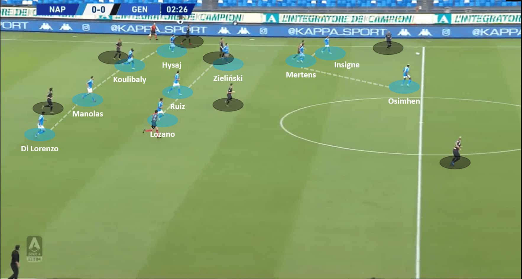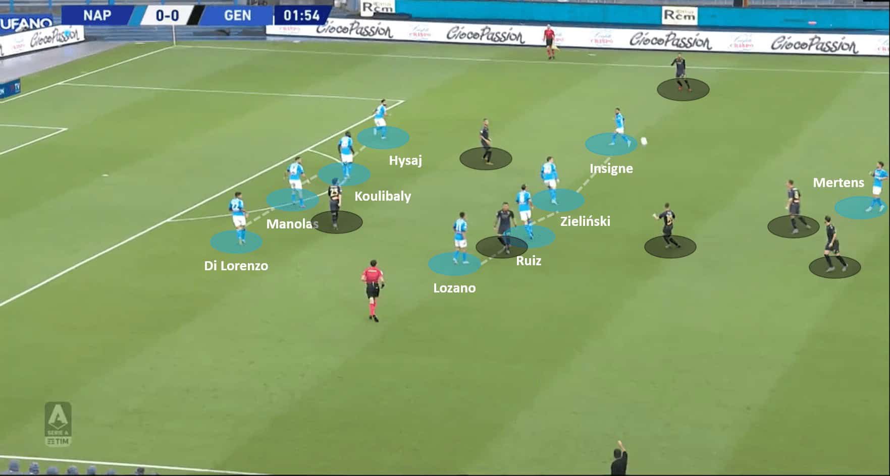 The last time Napoli put six past their opponent, was in season 2017/18 against Benevento Calcio. The kick-off was delayed due to Genoa keeper Mattia Perin tested positive for the coronavirus. Napoli played a strong brand of attacking football to thrash the visitors 6-0, after a successful yet modest scoring first half. The second half saw a drop in intensity for Genoa while Napoli continued their juggernaut tactics to dismantle the Genoa defence. This tactical analysis brings to light the tactics and plays that both the teams applied in the game. The analysis aims to highlight some of the events that unfolded in the game, which led to the scoreline.