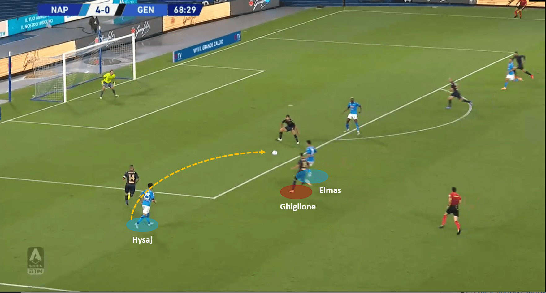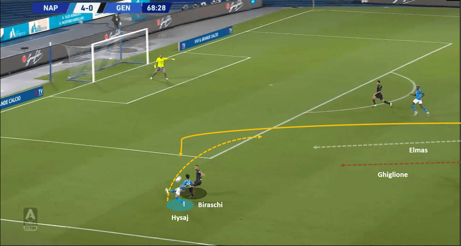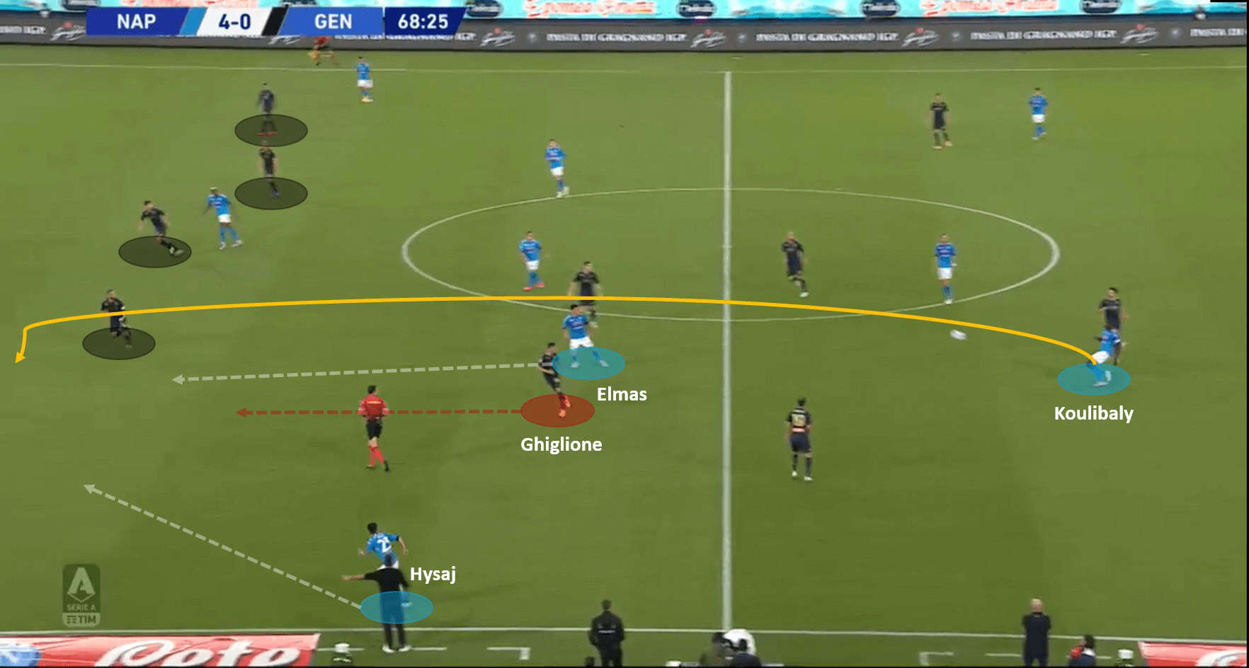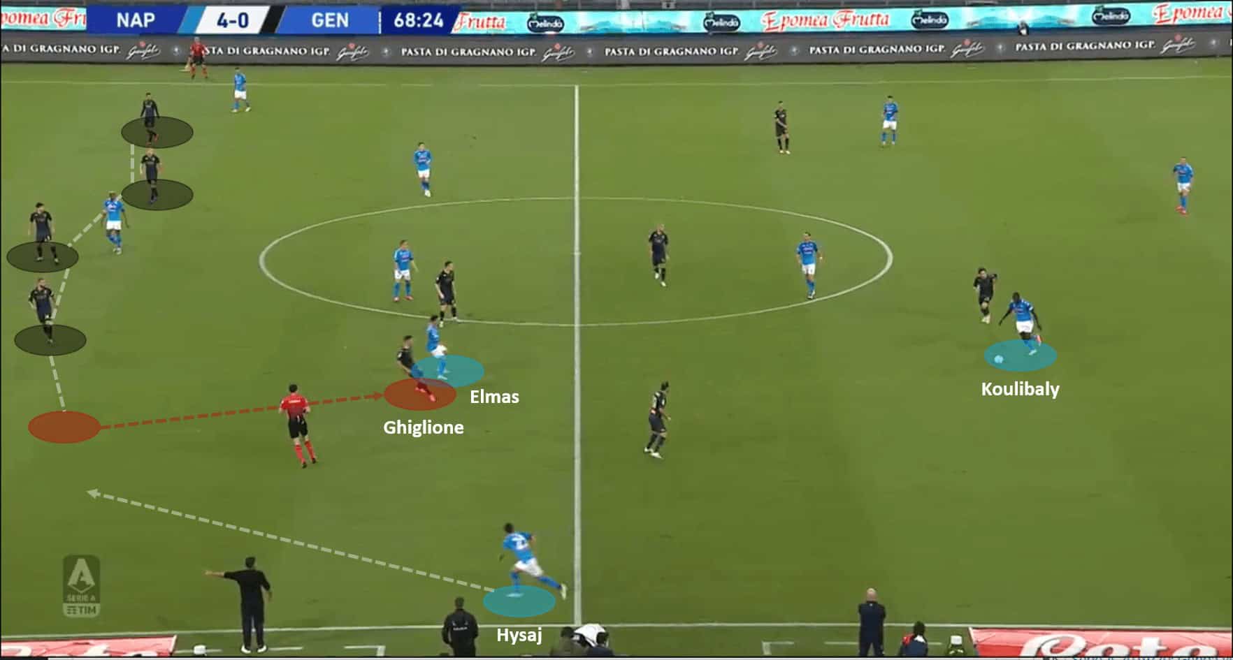This section of the tactical analysis takes a look at how unnecessary movement cost Genoa a goal. Genoa’s lack of press and movement was repeatedly brought out in the game, which even cost them goals. However, for this one, in particular, too much of it caused a goal. Elmas, kept teasing Ghiglione with his movement, since the time he came on. On this particular occasion, Elmas dragged Ghiglione out of his position, which broke Genoa’s back five. Hysaj and Koulibaly sensed the opening exploited it. Koulibaly played in a long ball to Hysaj who was charging into the gap and towards the final third. By now, Elmas and Ghiglione also rushed back into the gap to enter the fray. Hysaj controlled the ball beautifully before putting it into the path of the oncoming Elmas who converted the ball for Napoli’s goal. Ghiglione was completely outplayed by Elmas’ movement. The below images from the game support the analysis.