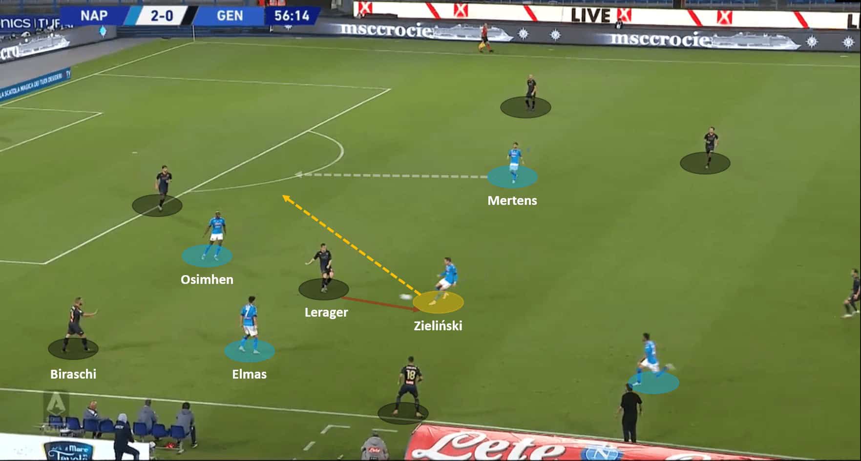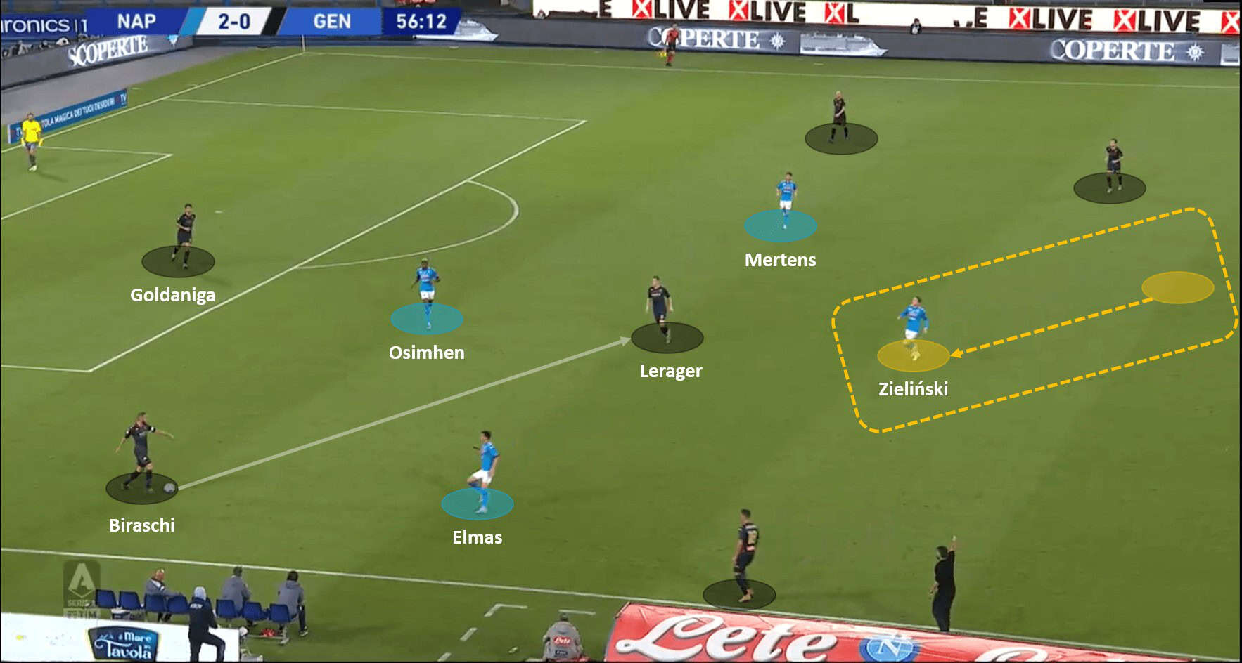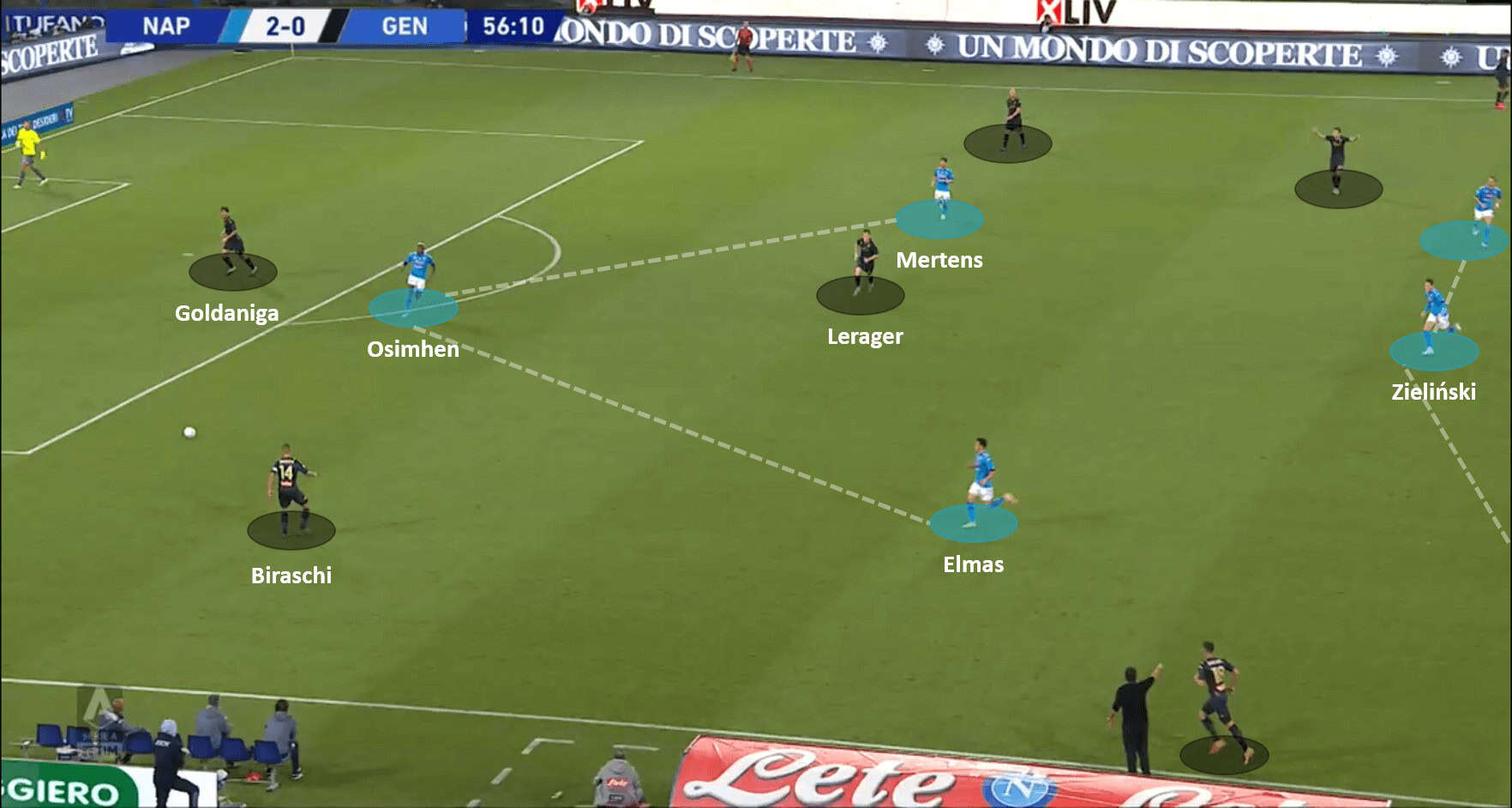 It isn’t just the lack of press from Genoa, but also the coordinated press from Napoli which led to the goals landslide. Take, for instanc, the goal involving Zieliński. Napoli were out of possession and pressing in their usual 4-3-3 when the ball was in the final third. The front three for the press – Elmas, Osimhen and Mertens. Napoli were clearly outnumbered in the final third, and Genoa were able to pass their way out. Zieliński spotted this, and moved in from the midfield to aid the press. This movement took Lerager by surprise and forced an error, which led to the goal. Below are the images from the game, which support the analysis.