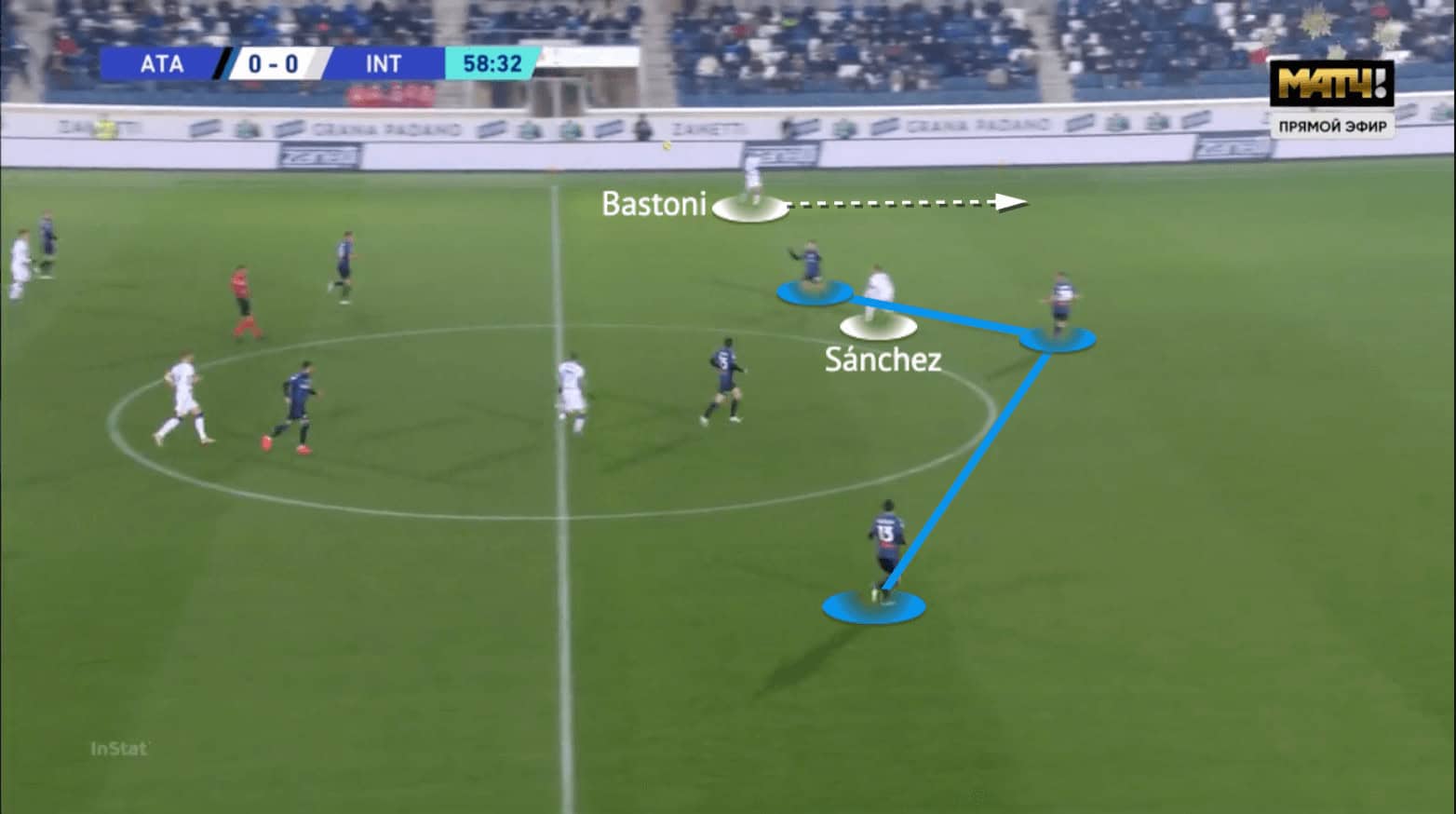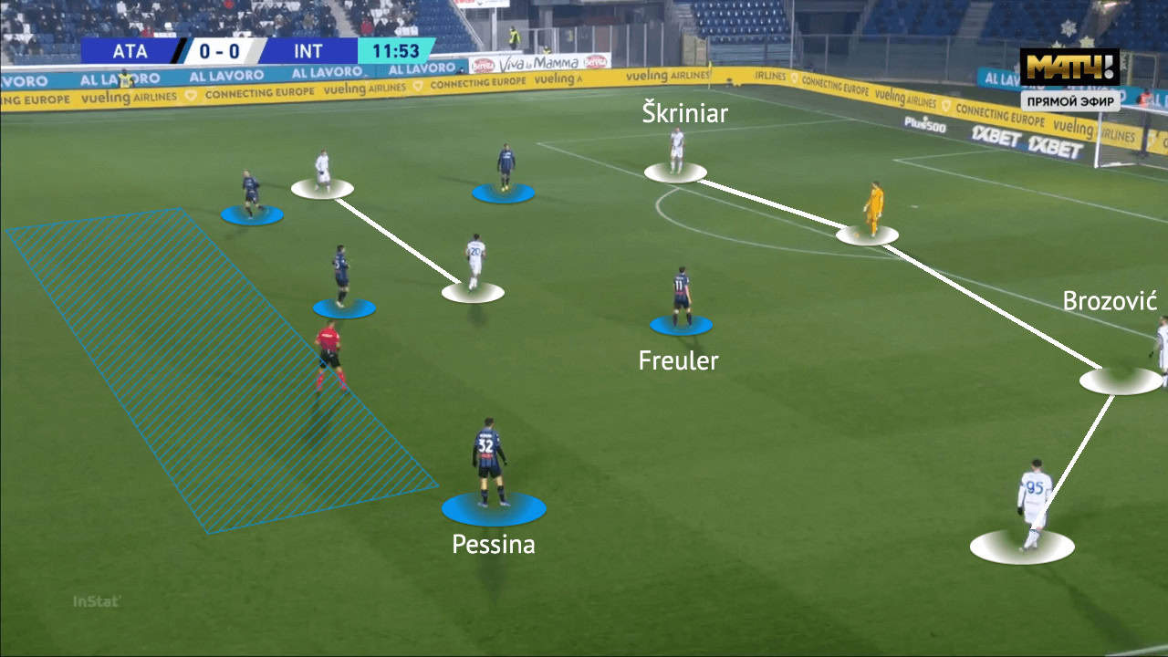 To disrupt the man-marking system, apart from movements, another solution could be players interchanging positions. For example, Brozović dropped to the first line to get rid of Freuler on this occasion, so he could face the opposition goal. Meanwhile, the other two midfielders were also staying deep to make sure the blue zone was big for the second ball battles. Again, Pessina was not marking Alessandro Bastoni tightly as he should balance the structure in a narrower position.