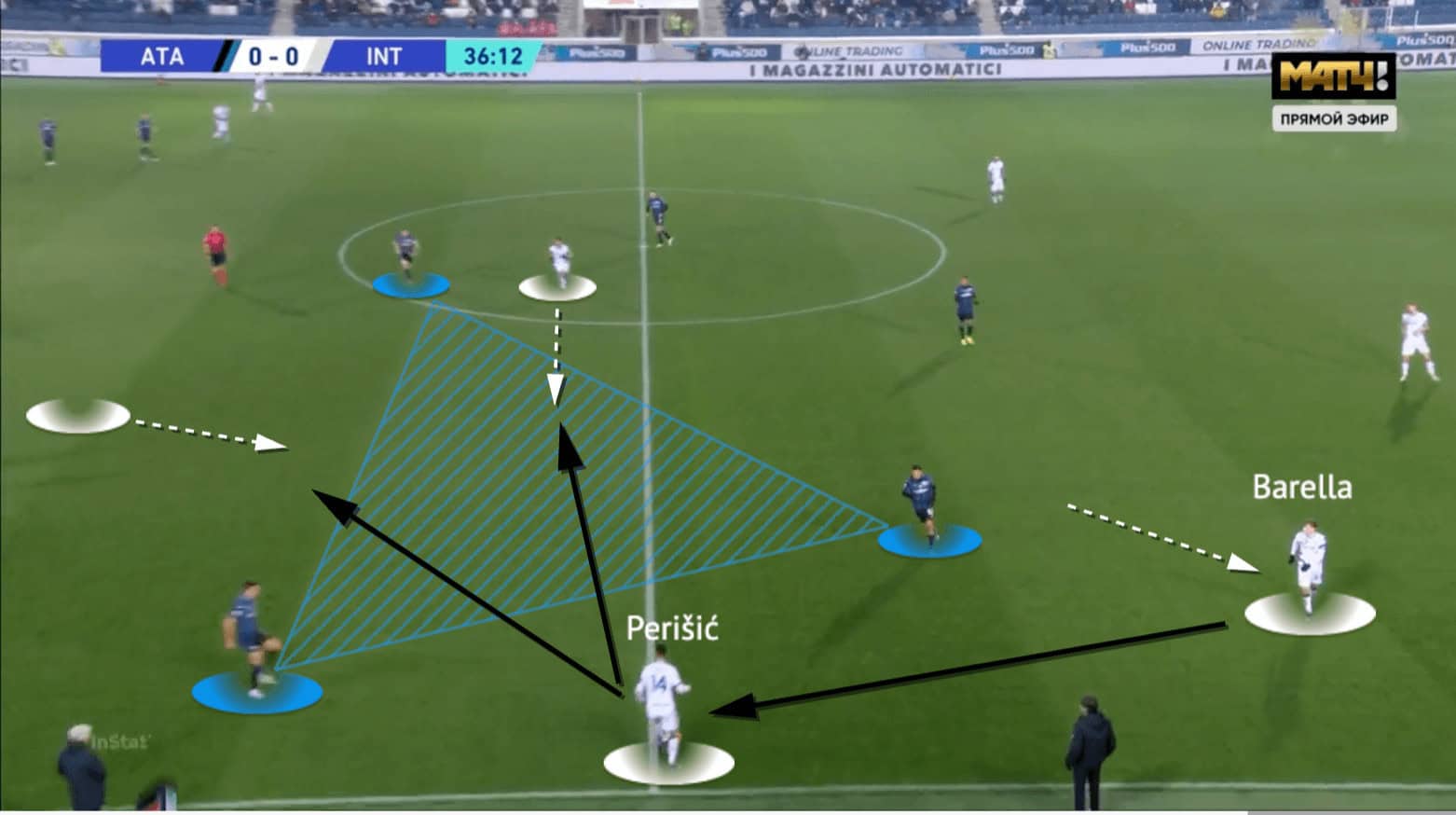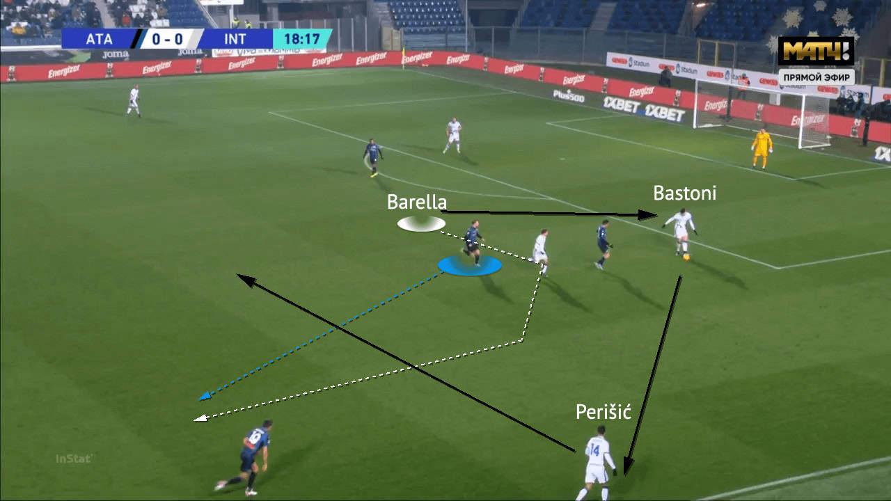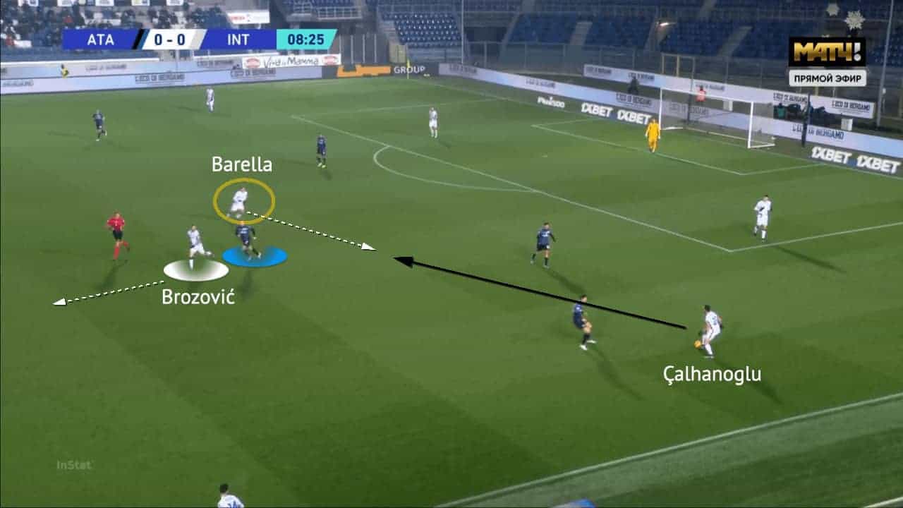 So far, we gave examples of Barella’s fantastic moves, they could be forward, vertical, and lateral. But sometimes moving backwards could also be a solution, the 24-year-old Italian International was very good at making functional runs to open spaces for teammates. In this example, he dropped very deep to draw the marker away from the centre. So, Perišić had spaces to play as the distances between Atalanta was enlarged, indicated by the blue zone.