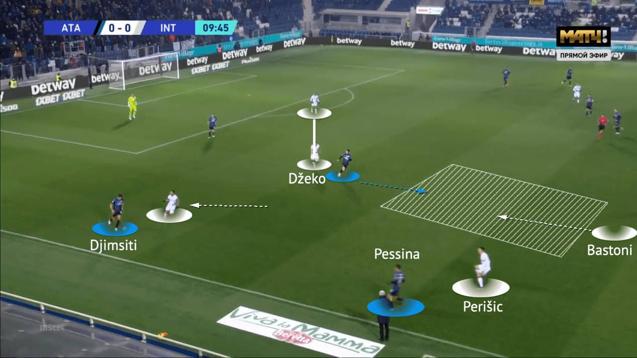 For example, here, de Roon went to find Djimsiti. In this attack, Pessina oriented himself towards the centre-back initially, and dropped to pull Bastoni away from the last line. That resulted in a big gap between the wing-back and Škriniar, and it would only be bigger as Perišić would come out to press Djimsiti. But Atalanta did not generate huge threat by playing those balls as Muriel was not going behind of the defence at the right moment.