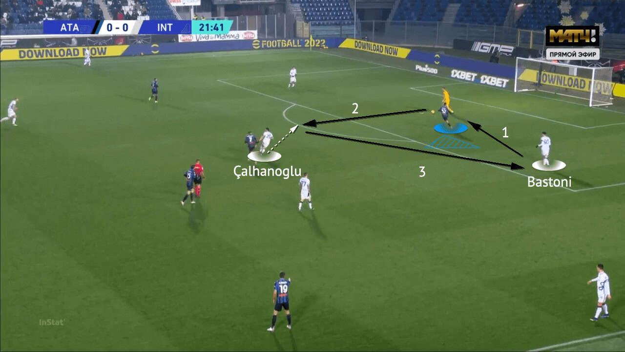 Usually, the goalkeeper would kick the ball away in such a case, but Handanović managed to connect Çalhanoğlu with a short pass. The Turkish international also did well by checking the marker’s position upon his arrival. Then, just one clever touch to find Bastoni, who became free after Pessina went for the goalkeeper. The whole sequence was a textbook counter-dynamic passing route to cancel out the press, this made the pressing of Atalanta in vain and Inter cleverly switched the free player from Handanović to an outfield player, who had a greater autonomy to bring the ball forward.