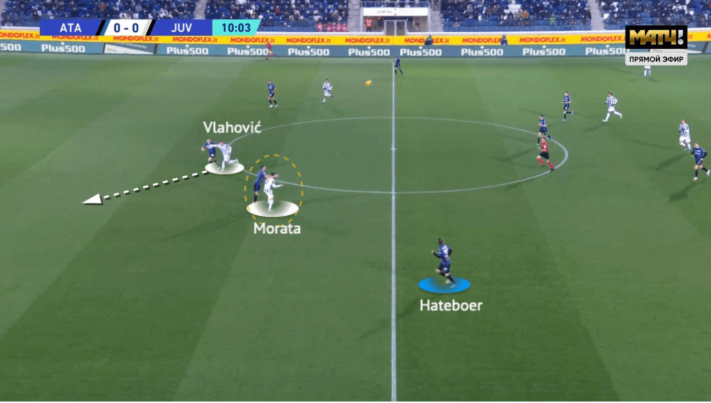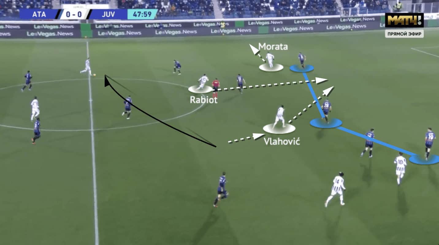 The above image shows Vlahović switching the ball to the left side, then running back to attack depth. The gap between Tolói and Demiral was enlarged because Morata moved outside, even knowing that he might not be the receiver. Apart from Vlahović, Rabiot also read that gap and tried to exploit it, but the timing of De Sciglio was not right so the pass did not happen. Anyway, it shows how Juventus wanted to attack Atalanta by deploying Morata as a left-winger.