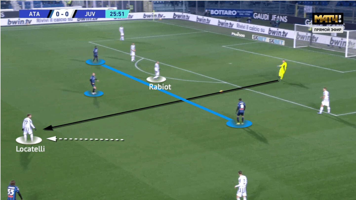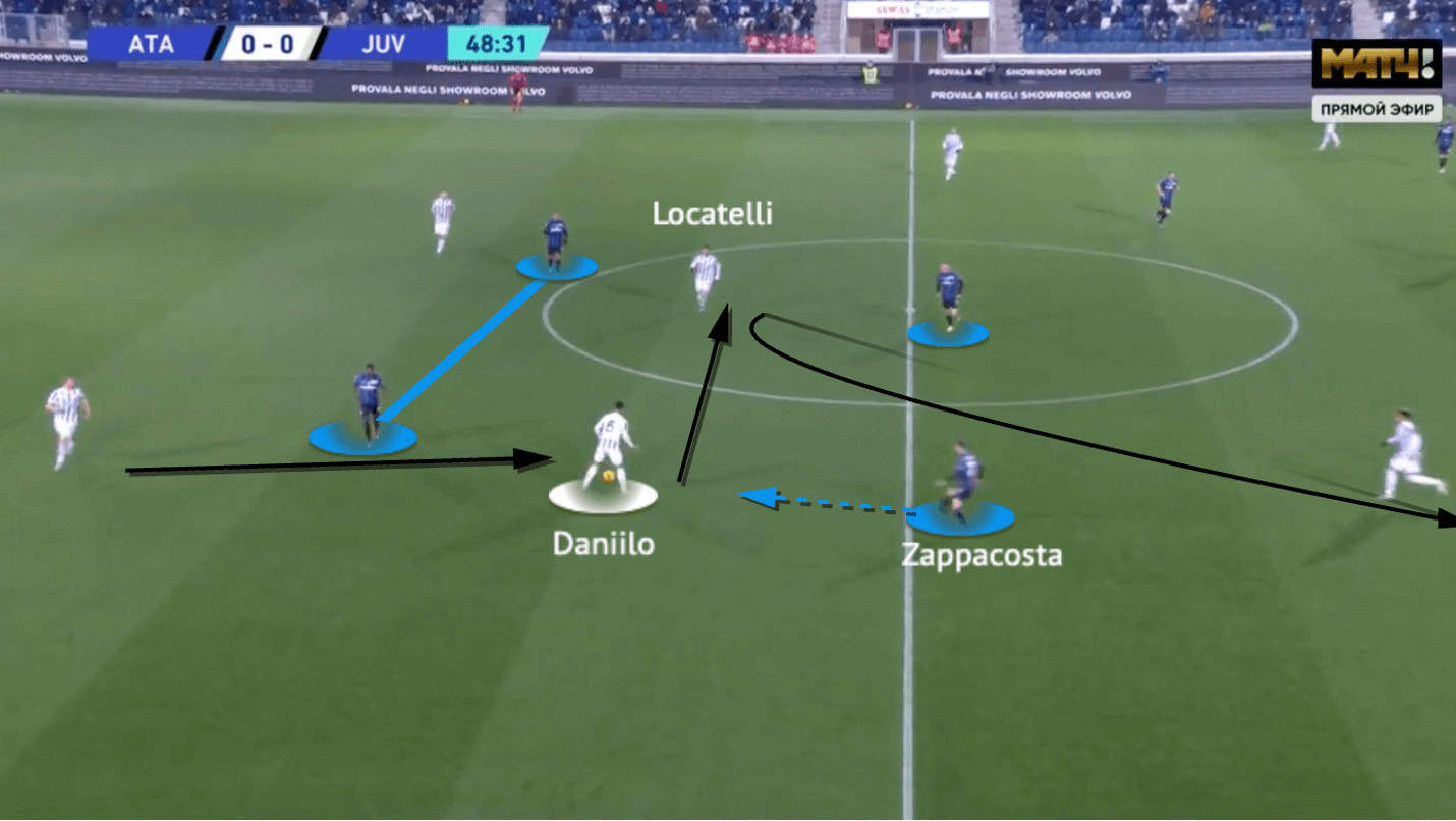 Around 30 minutes later, Allegri established a clearer direction for his team by inverting Danilo into the centre more often. So, he became the extra player to help Locatelli instead of a midfielder dropping deep because Rabiot’s energy was needed in the forward runs closer to the final third. That became an important part of Juventus’ construction process as the Atalanta left wing-back always arrived late on Danilo, and mostly from the touchline, he could not block the angle of the pass.