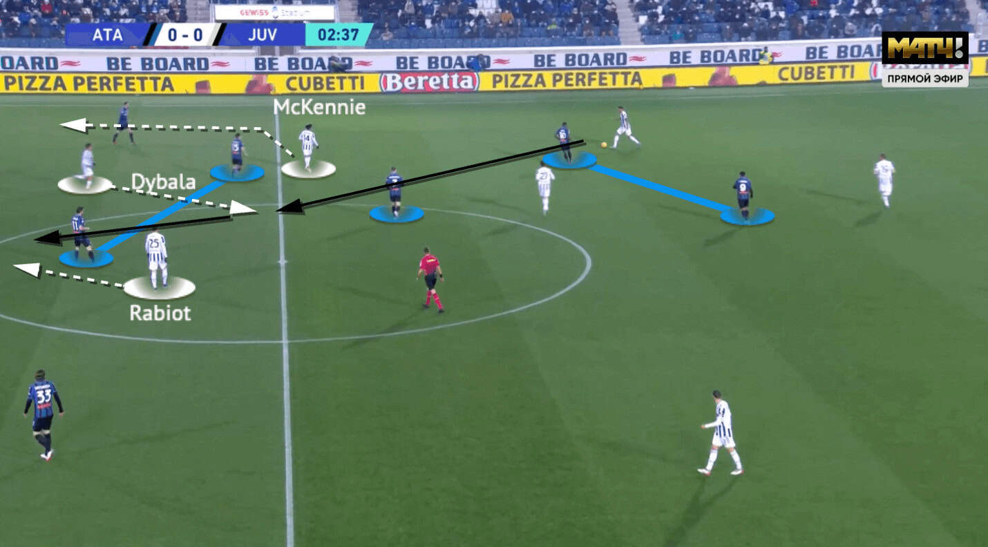 This scenario shows McKennie never expect the ball to his feet in the centre, and he smartly ran forward to draw de Roon away, allowing Dybala to receive in that space. Then, after the pass was made, Rabiot moved into spaces behind Freuler to give Dybala a progressive option. Just two or three passes with decoy movements off the ball, Juventus advanced the attack to the offensive third very quickly.