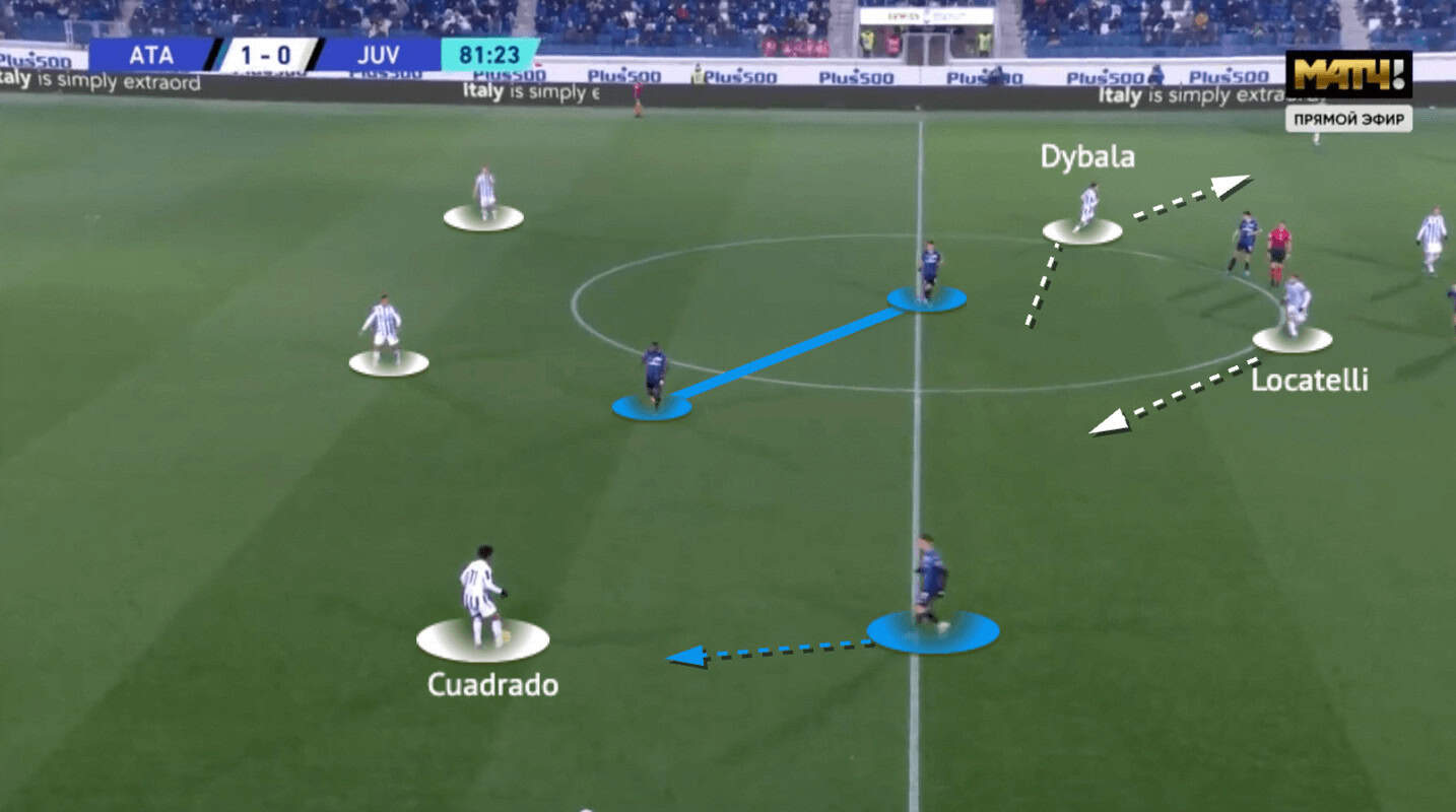 The screenshot was an instance in which Dybala already drifted away from the centre, because his initial space occupation did not receive a pass, he went away to vacate the space again. Then, to fill that central zone and offer an option to Cuadrado, Locatelli dropped to help. These kinds of off-ball movements and space vacations were quite important in Juventus’ attacks.