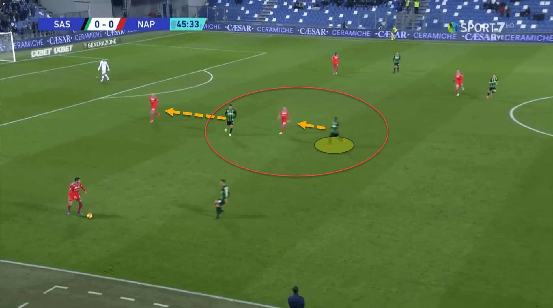 Sassuolo set up in a 4-3-3, as stated, which switched to a 4-5-1 out of possession. Napoli used a 4-3-3 in possession with Lobotka operating as the lone pivot. In the defensive phases, Dionisi instructed Scamacca to press Napoli’s centre-backs while applying a cover shadow to Lobotka.