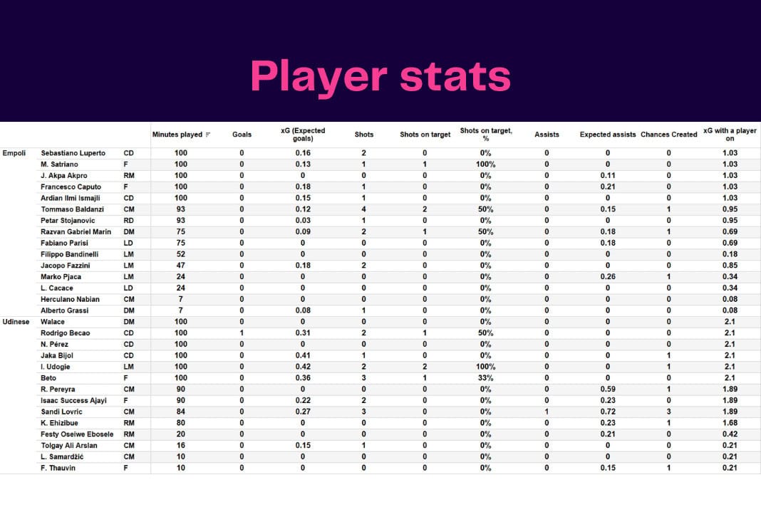 Who was Udinese‘s biggest threat? Who made the most recoveries in the opposition half? Who had the highest xG in the match?
