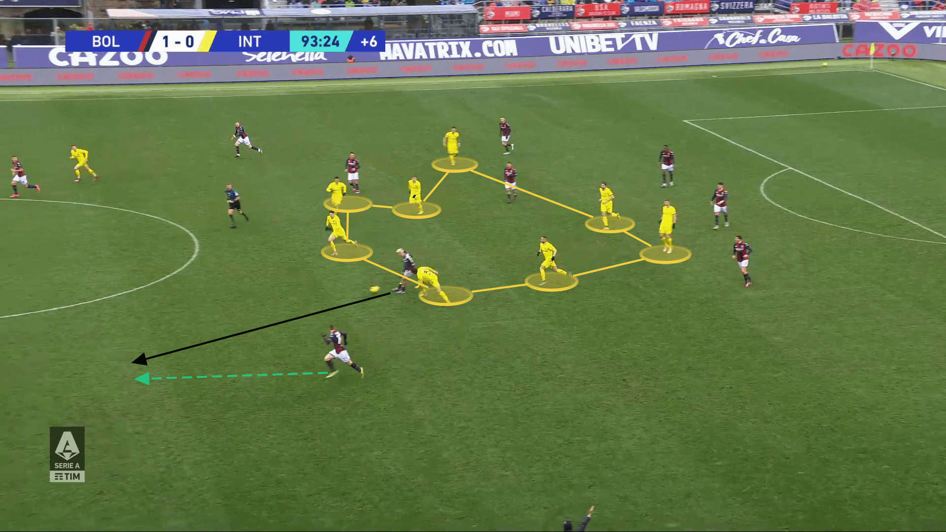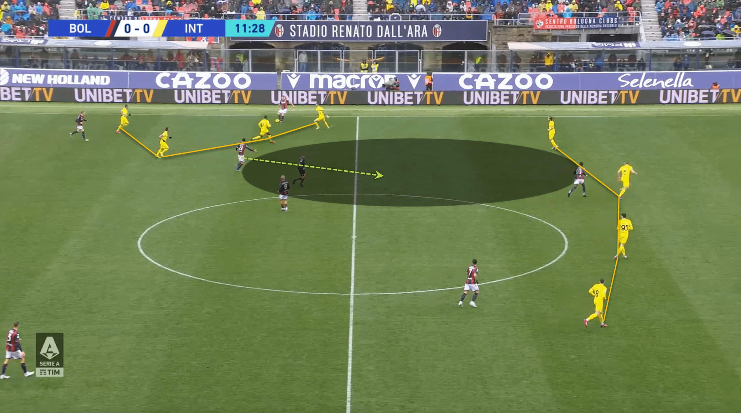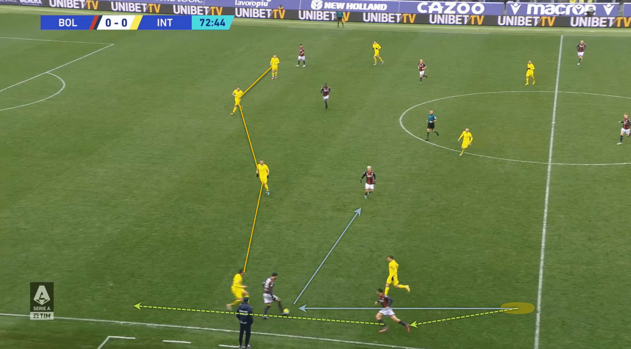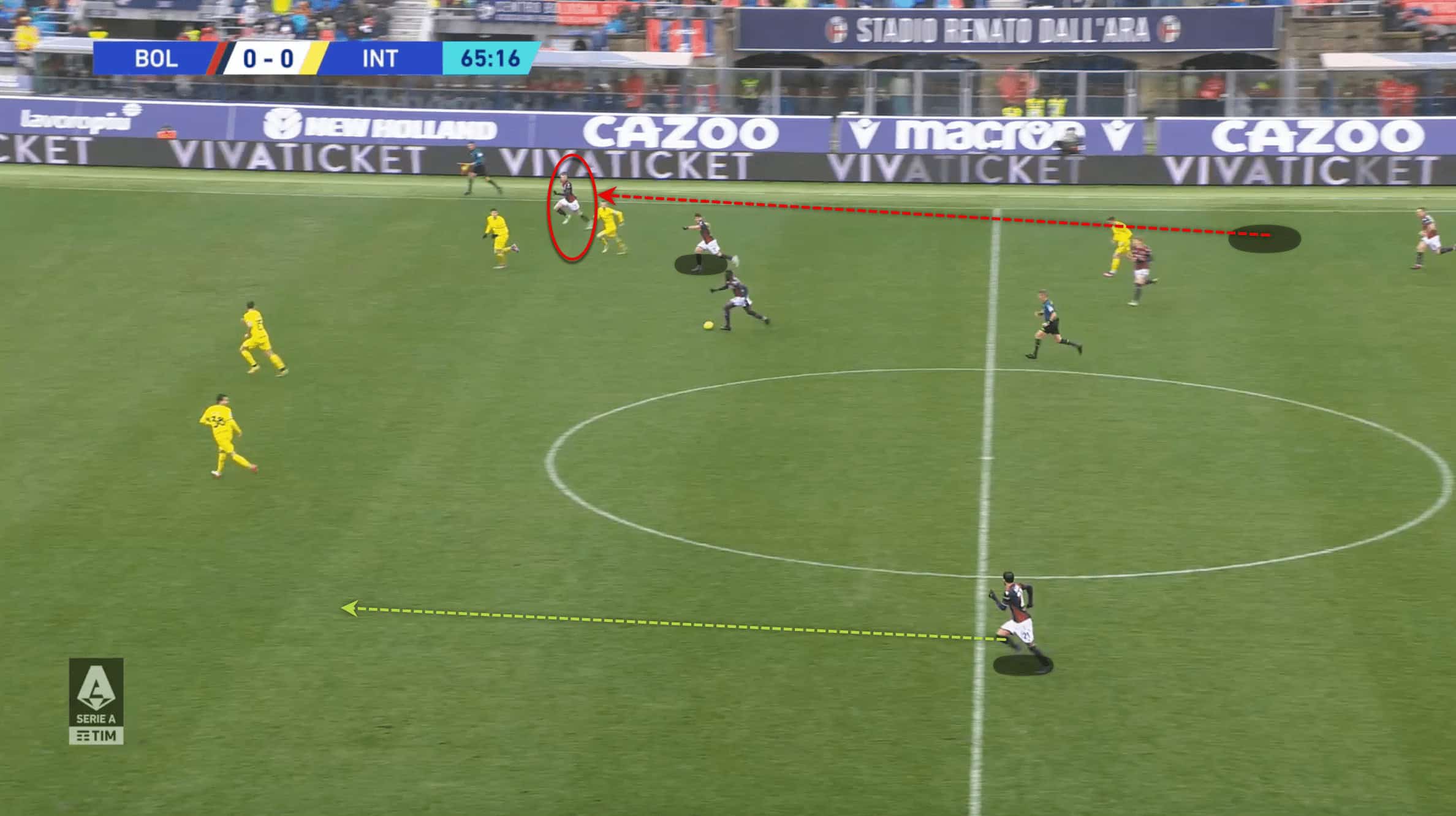 Although this example was not successful in the game, these are the scenarios Bologna worked up frequently to scare Inter. They were never comfortable dealing with these situations. It was utterly unpleasant for Inzaghi’s men.