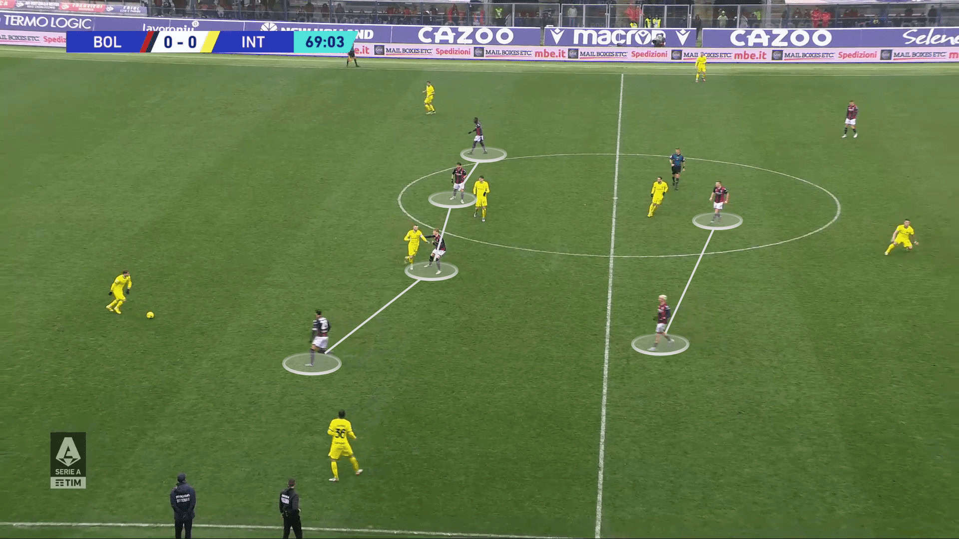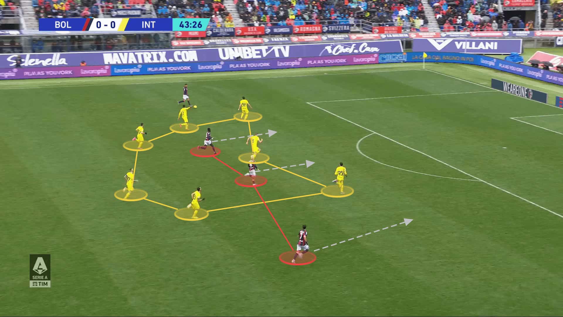 After having a goal disallowed earlier, Bologna were given another opportunity to score just before halftime. About seven Inter players had retreated to defend against a counterattack. A rather small group, with four players, the Bolognese were heavily present at the heart of the transition.