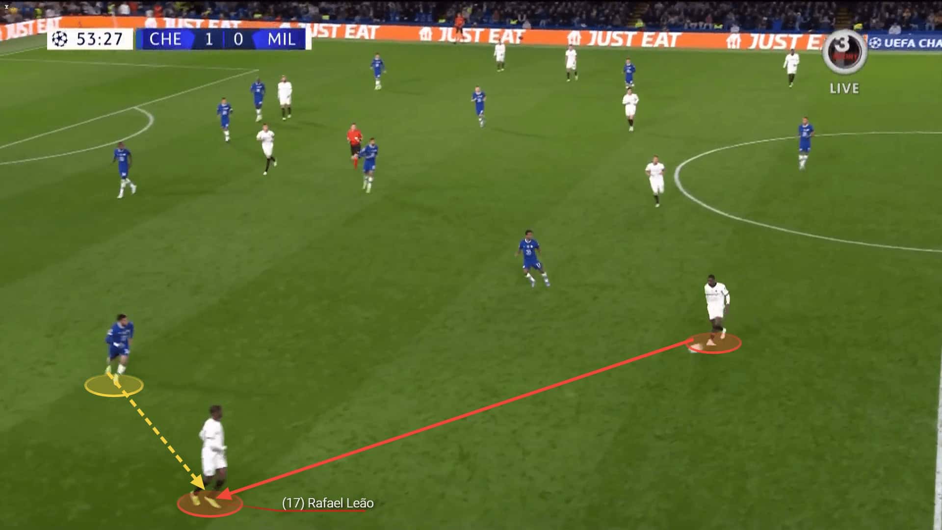 His movement in and around the box becomes crucial for the team and he can take advantage of Leão engaging the Juve players on the left and make runs to the box to threaten the goal.