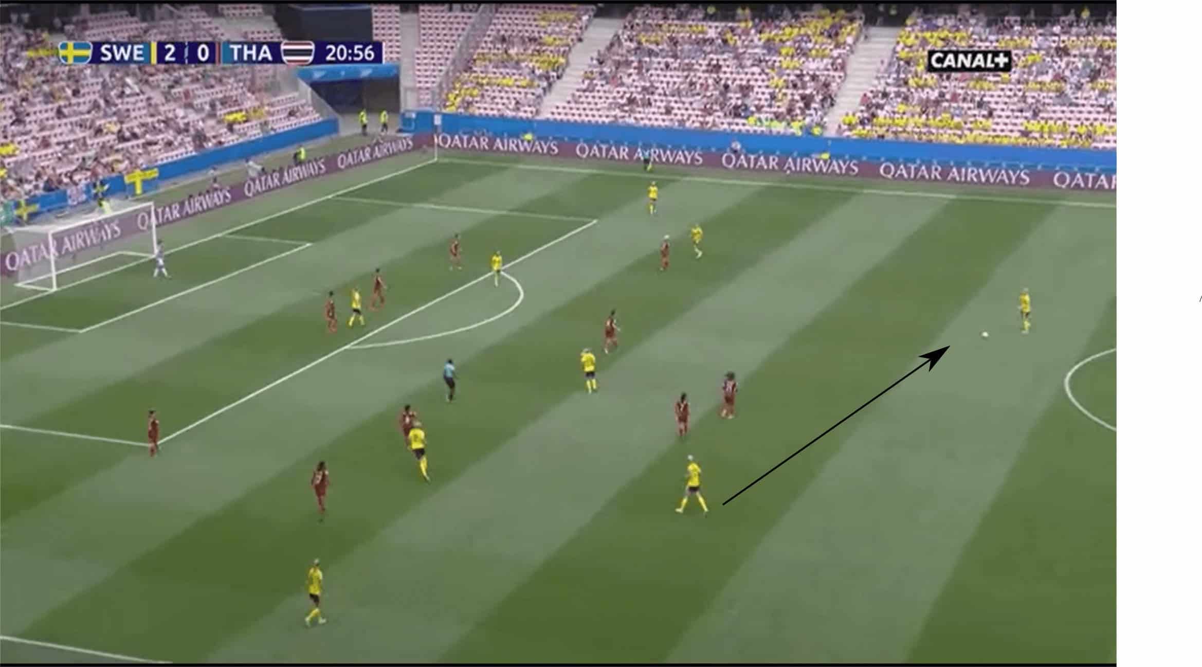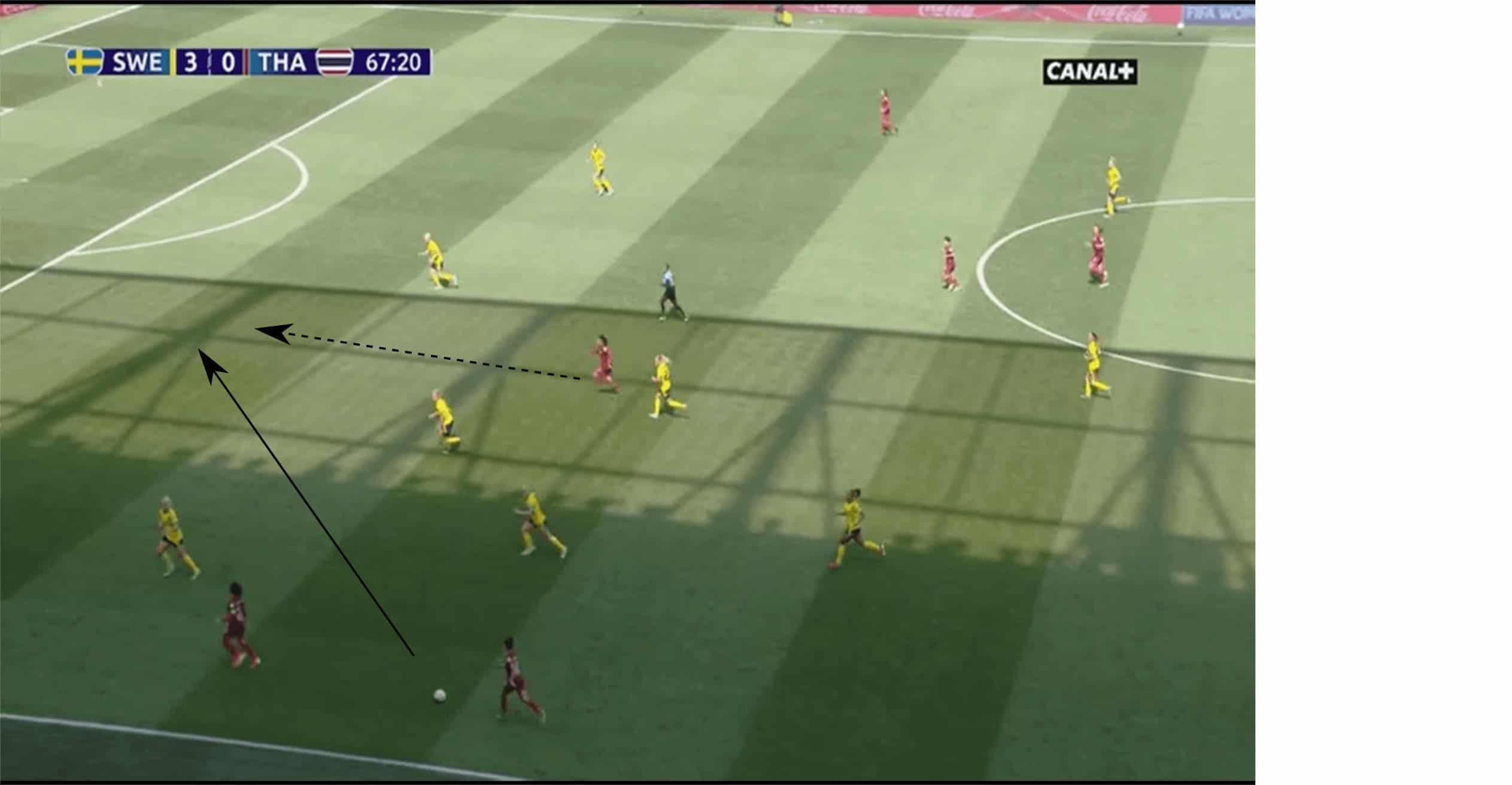 In the stoppage time, Thailand started a last, ferocious counterattack. They were able to create a two against two situation. Sweden weren’t able to run back in time. Both Swedish defenders concentrated on preventing the pass into the centre, which enabled Kanjana Sung-Ngoen to score “a goal that meant so much” for Thailand. The lack of aggressive and intelligent counterpressing along with an offensive mindset and a high defensive line causes these problems for Sweden. Against stronger opponents, this can break their neck.