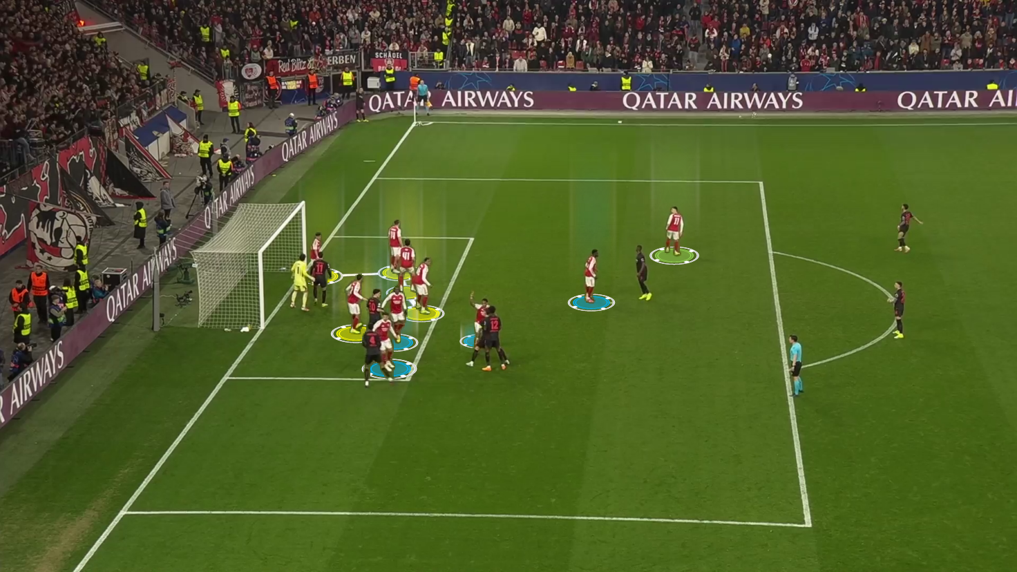 Figure 1 below shows how Arsenal defended corner kicks against Bayer Leverkusen, with the corner that led to the hosts’ goal.