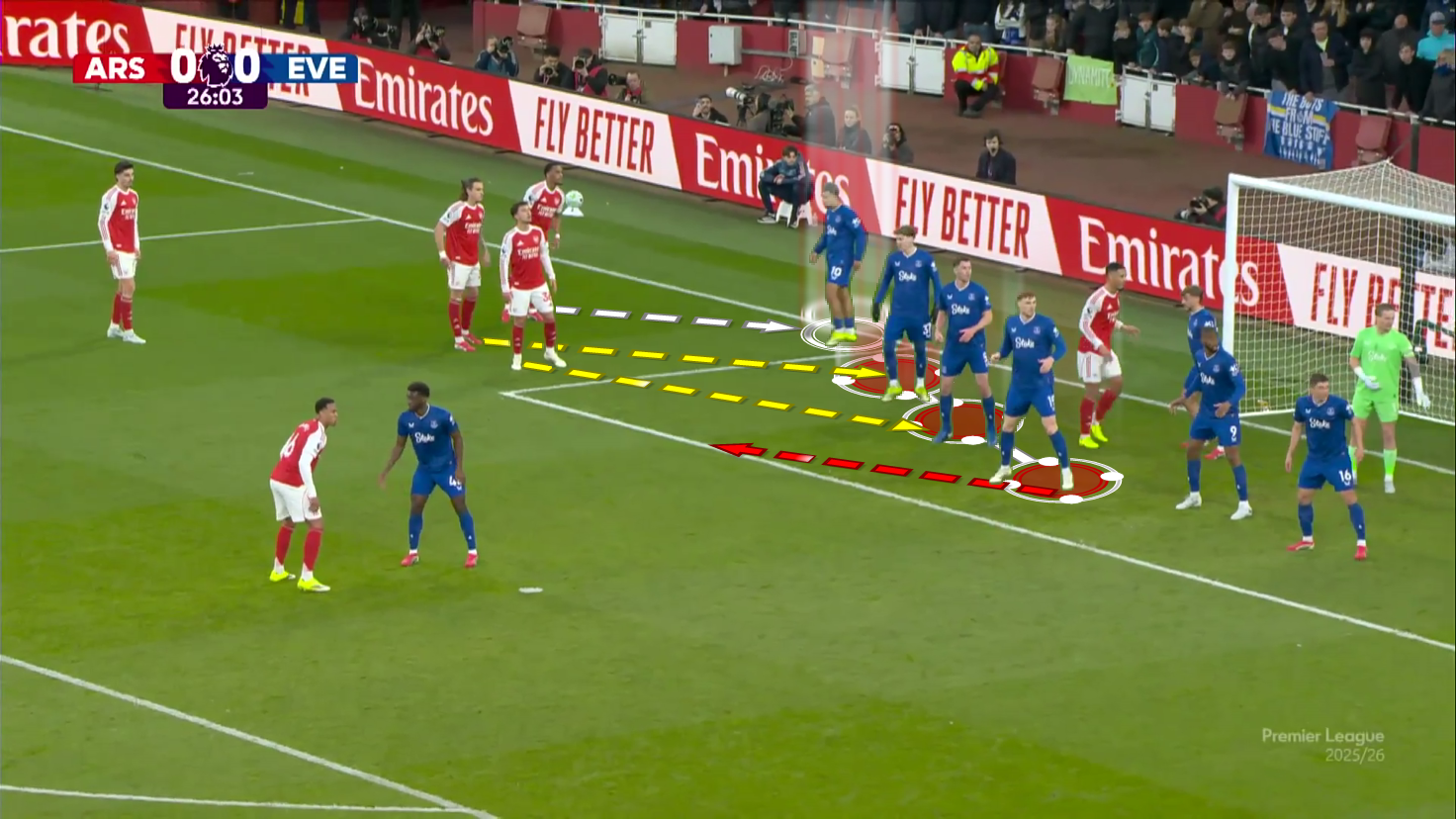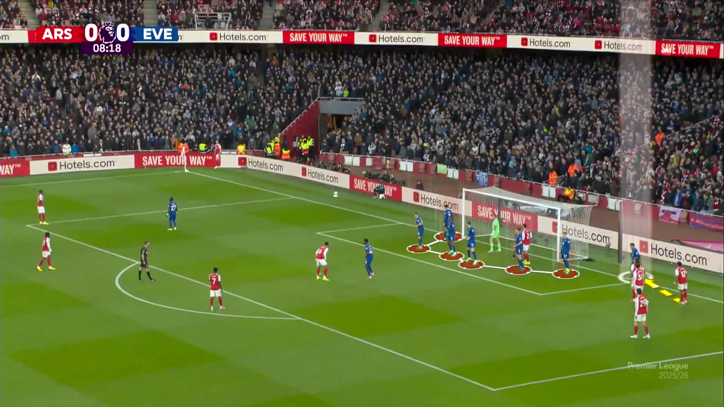 Bayer Leverkusen may use Everton‘s defending trick that they showed in the last Premier League game for Arsenal, which is using six zonal defenders (three of them more toward the far post) and a man marker (white) who stands on the line in an open body shape like a zonal defender in the beginning, as in Figure 26 below.