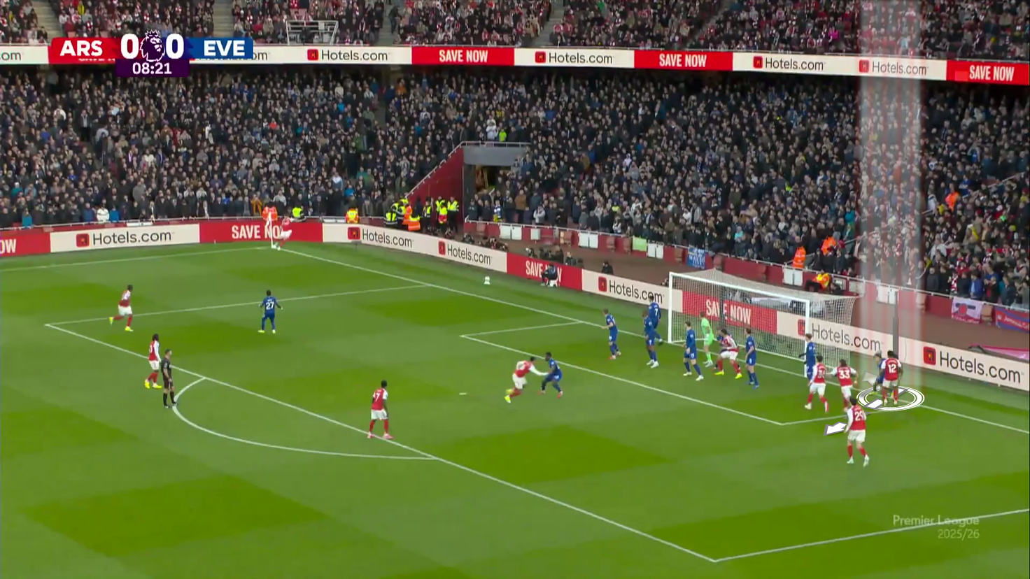 As shown below, the idea succeeded, leading to a dangerous chance, but we need to mention that Arsenal’s blockers need to be more careful, especially in the UCL, and leave the defender free as quickly as they can, because the referee whistled a foul against the last blocker.