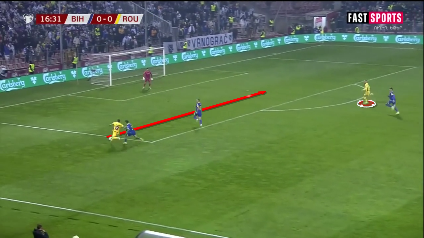 The following goal action showcases one of the times when Bosnia and Herzegovina’s wing-back Bajraktarević was allowed some time and space to penetrate, and the result was a magnificent solo effort that led to a goal.
