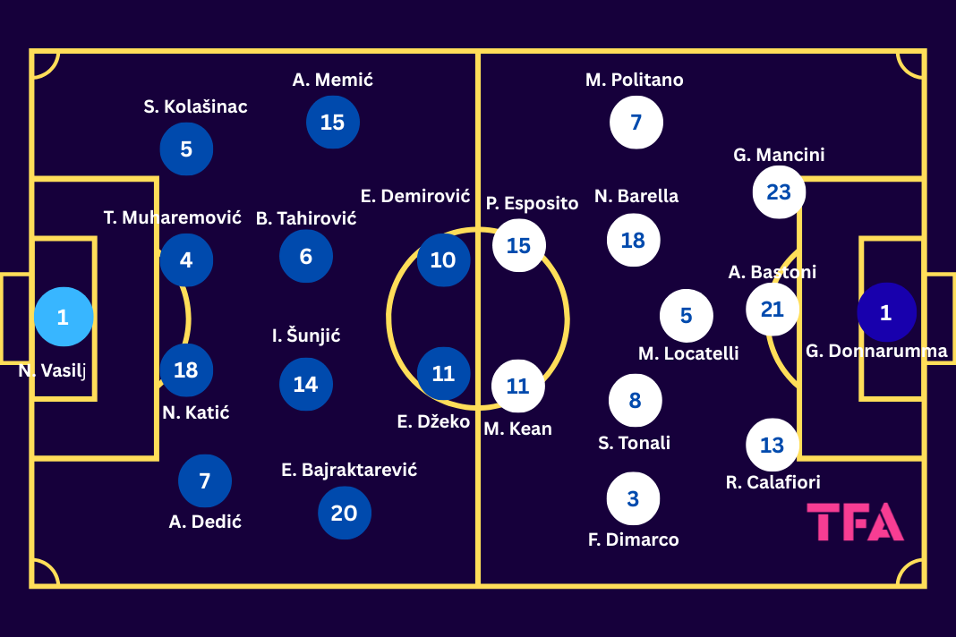 in Tactical Preview, 3-5-2 Formation, 4-2-3-1 Formation, 4-4-2 Formation, Amar Memić, Analysis, Bosnia & Herzegovina, Edin Džeko, Ermedin Demirović, Esmir Bajraktarević, Federico Dimarco, Francesco Pio Esposito, Gennaro Gattuso, Italy, Mateo Retegui, Moise Kean, Nicolò Barella, Sandro Tonali, Sergej Barbarez