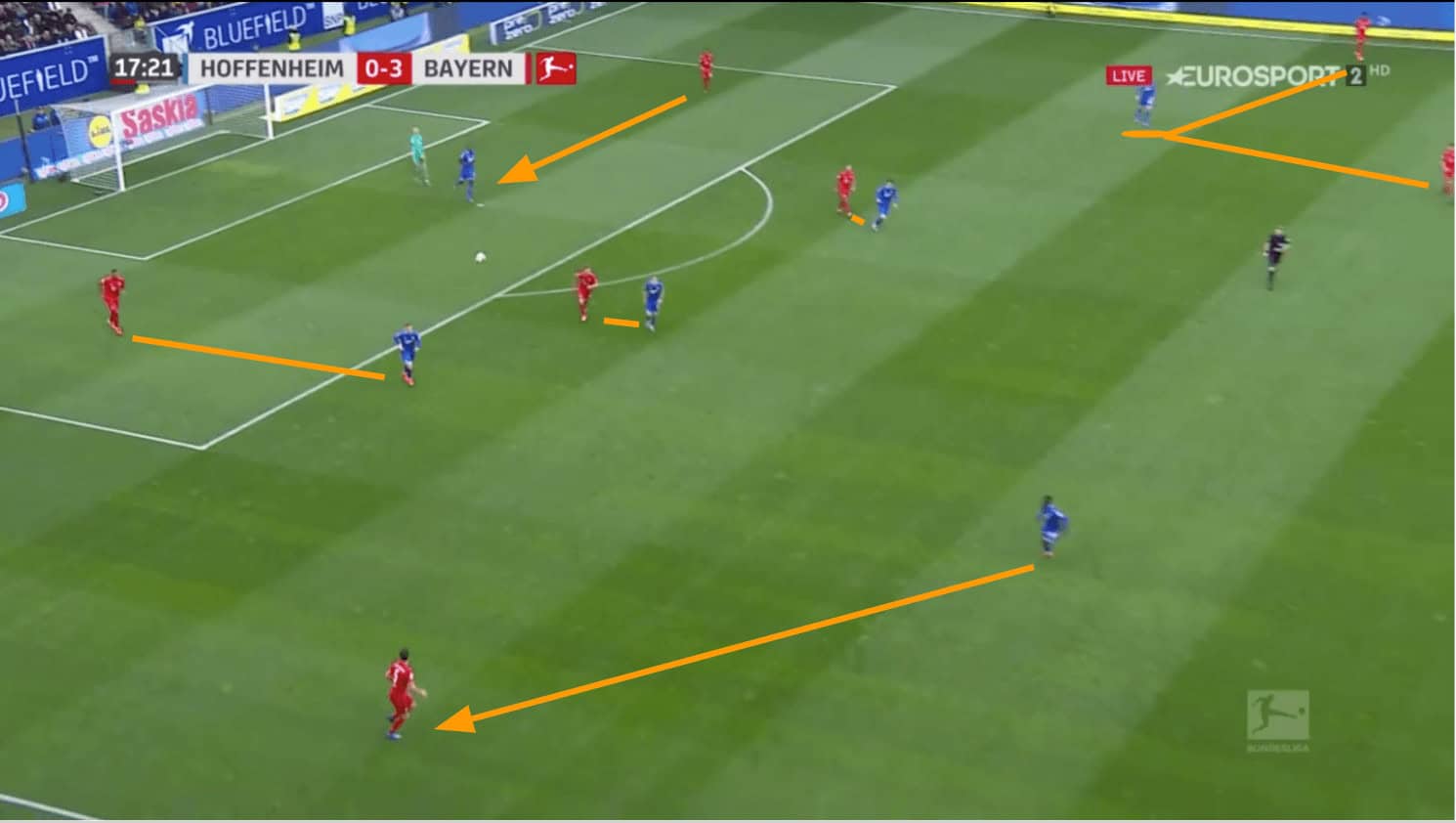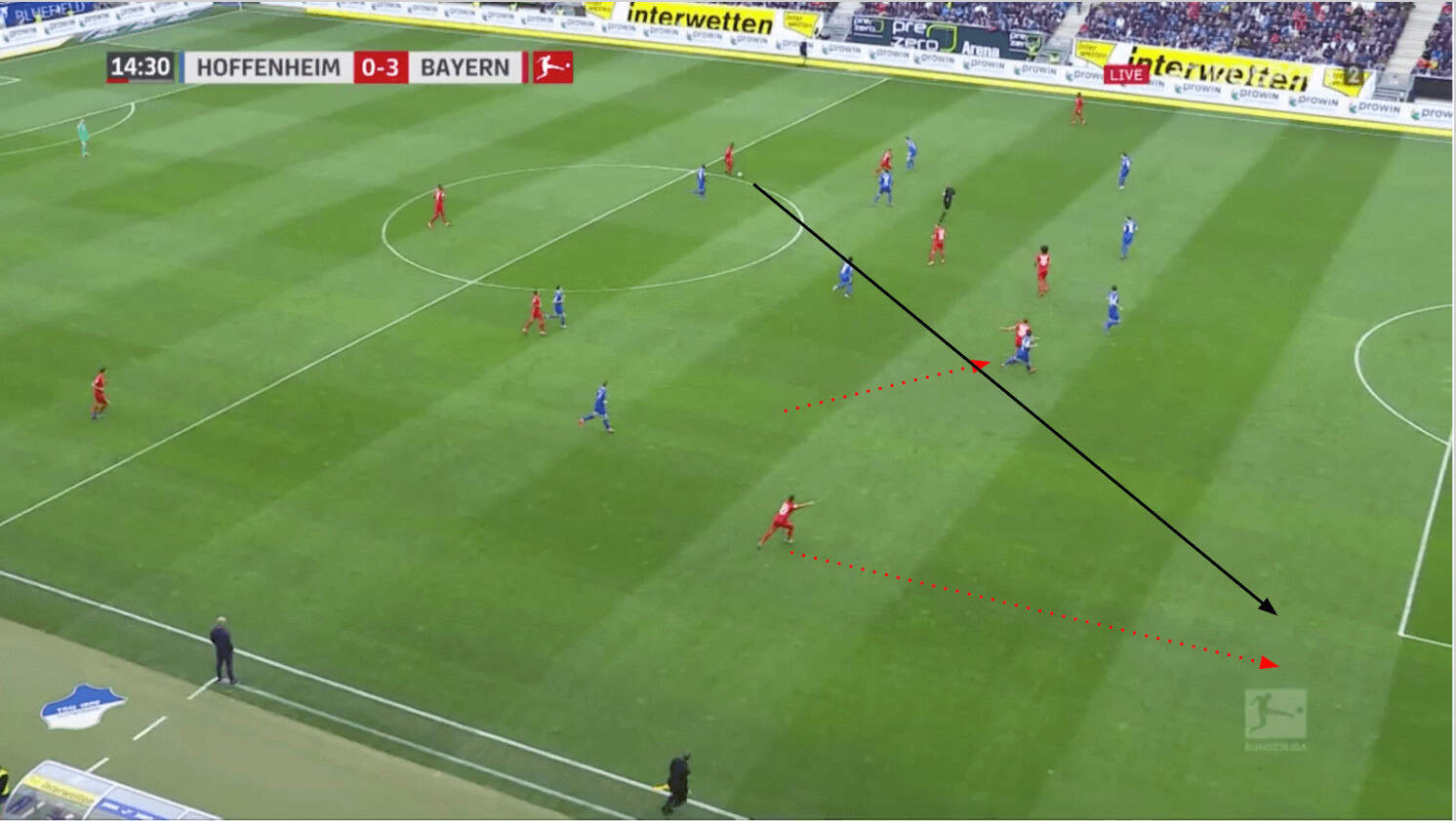 Against Hoffenheim, one of the best examples of this is shown above. Alaba attracted attention by dribbling from the centre of the pitch into the right half-space. As he did, the Hoffenheim defence shifted accordingly, following the large number of Bayern attackers who followed suit. Thomas Müller’s run towards the centre of the pitch drags his defender with him, opening up loads of room for Serge Gnabry to receive the ball. While Hoffenheim’s left-back was able to shift over and cover Gnabry, the problems come from the other Hoffenheim defenders, who were not able to pick up the rest of Bayern’s attackers, ultimately resulting in Bayern’s third goal of the afternoon after Gnabry crossed the ball in.